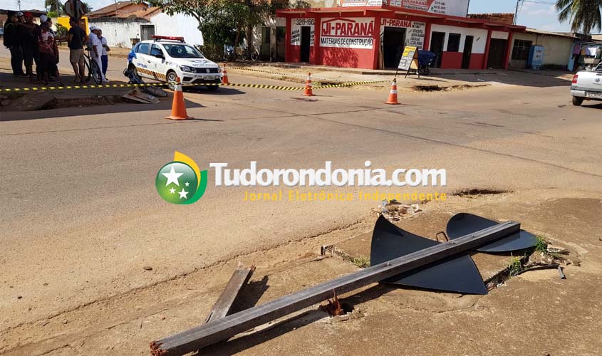 O motorista perdeu o controle da direção do veículo, que passou por cima de uma calçada, derrubando uma placa de sinalização.