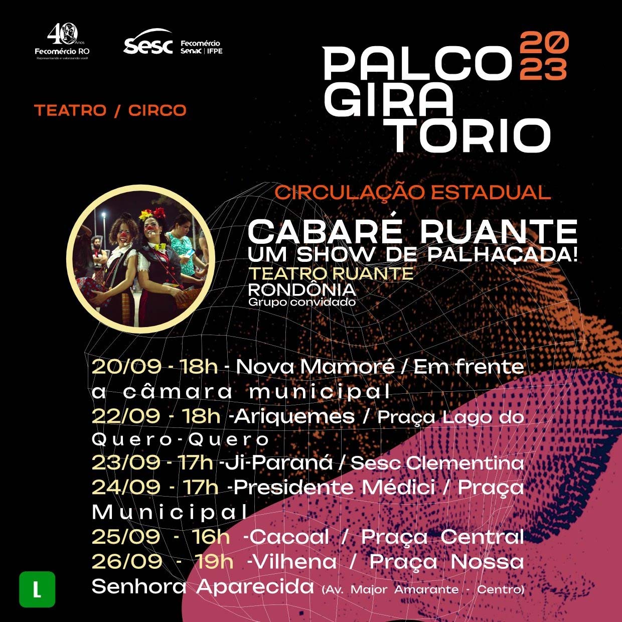 O projeto ‘Palco Giratório’ começou em Porto Velho e na próxima quarta-feira (20) cidades do interior também começam a receber espetáculos de um dos maiores projetos culturais do país. As apresentações comemoram 25 anos de história no Brasil e também os 40 anos do Sistema Fecomércio (Federação do Comércio de Bens, Serviços e Turismo) em Rondônia.
