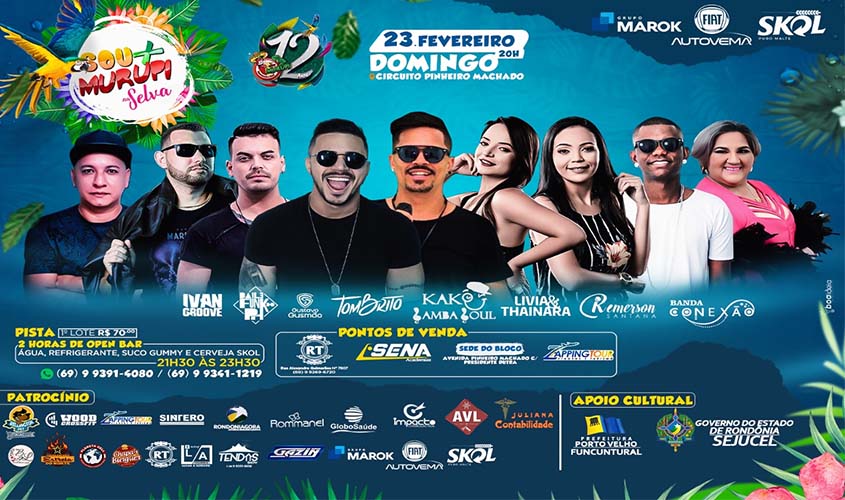 Neste carnaval em que comemora 12 anos de existência o Bloco Murupi apresenta várias atrações musicais com ritmos diversos, um super trio elétrico, orquestra de frevo, passistas, bonecos gigantes e duas horas de open bar (cerveja Skol, água, refrigerante e suco gummy).