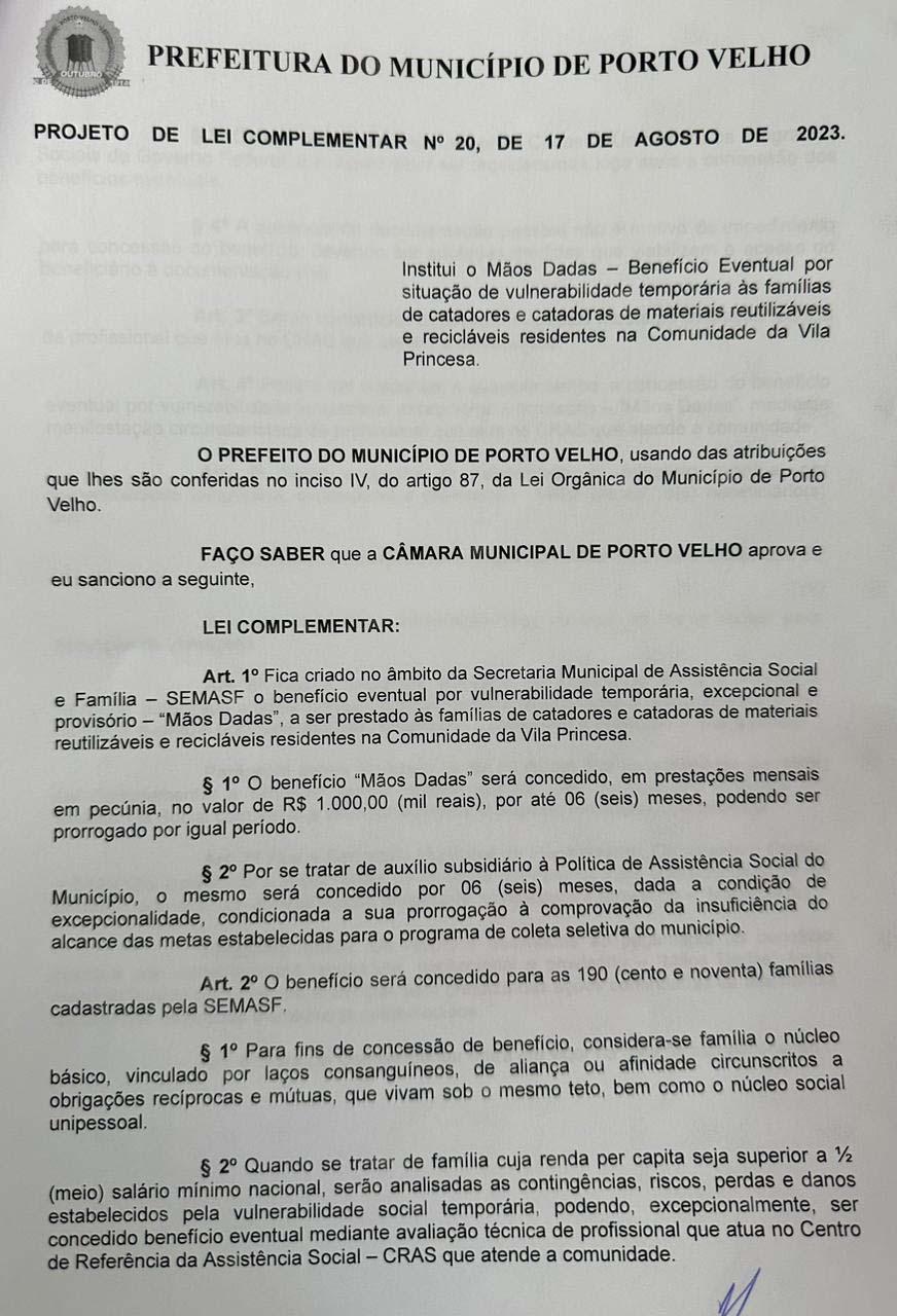 Porto Velho, RO - A Câmara Municipal de Porto Velho vai votar na próxima segunda-feira um projeto de lei complementar que busca instituir o Programa Mãos Dadas, um benefício eventual destinado às famílias de catadores e catadoras de materiais reutilizáveis e recicláveis residentes na Comunidade da Vila Princesa.