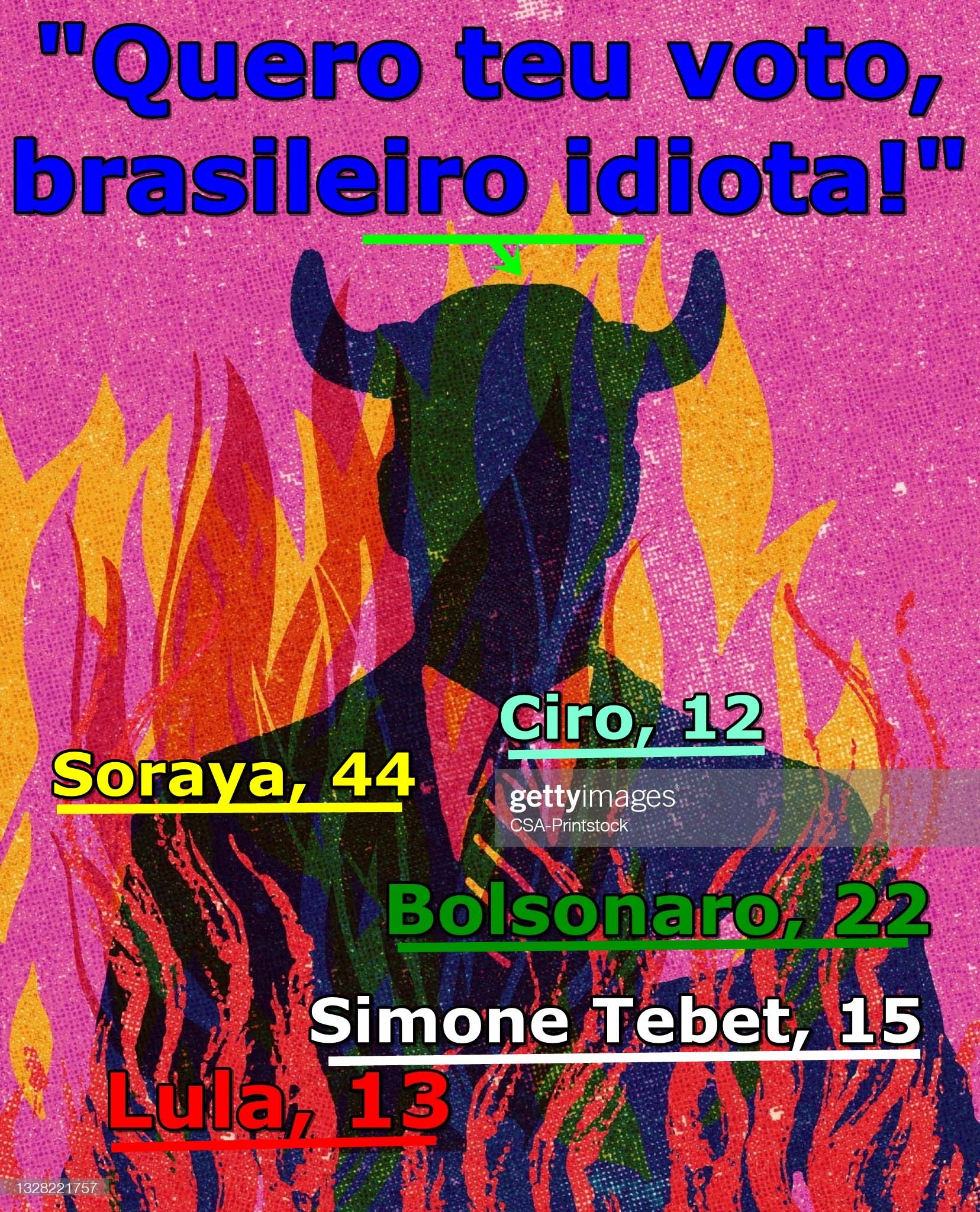 Não é Lula nem o Bolsonaro que disputam o poder nestas eleições. É o Cramunhão e a mãe dele. Assim, soa como normal para qualquer político ser fotografado comendo pastel numa feira enquanto por trás, seres humanos reviram lixo à procura do que comer. E não é o Brasil africano criado somente para adornar campanhas políticas, é o Brasil real, aquele do dia a dia. Deve ser por isso que depois de toda eleição neste país, os pobres continuam sempre mais pobres e os ricos, eleitos ou não, voltam para os seus condomínios de luxo, para os seus bons empregos e para a sua vida de farturas. A cada dois ou quatro anos a ladainha sempre se repete e depois a triste realidade volta a bater na cara de todos nós. Dessa maneira, direto do Mármore Quente, o Tinhoso tem a certeza de que sempre guiou corretamente toda essa despolitizada gente. E que ainda vai continuar nos guiando.