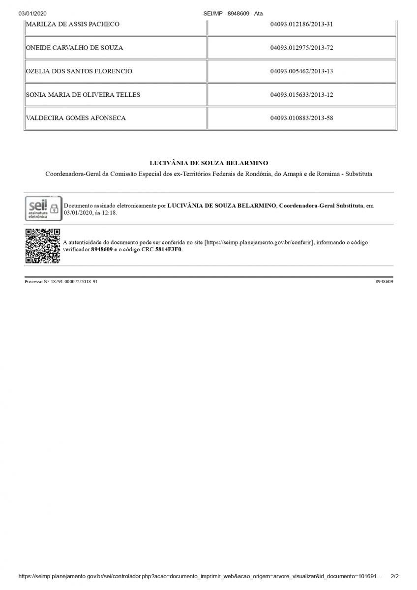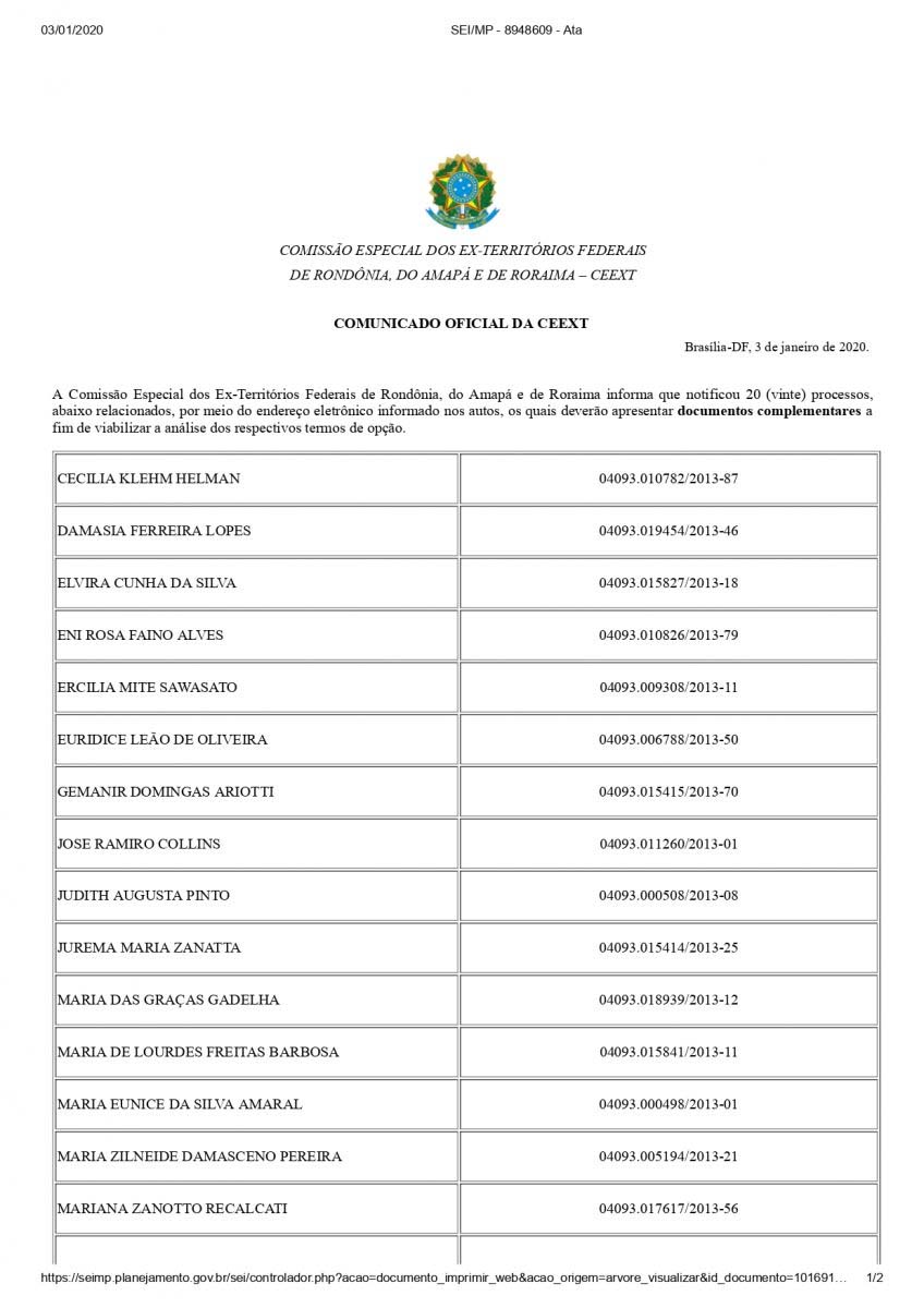 A Comissão Especial dos Ex-Territórios Federais de Rondônia, do Amapá e de Roraima (CEEXT) divulgou na sexta-feira (10/01), que notificou 20 servidores de Rondônia via endereço eletrônico, solicitando apresentação de documentos complementares para análise de processos.
