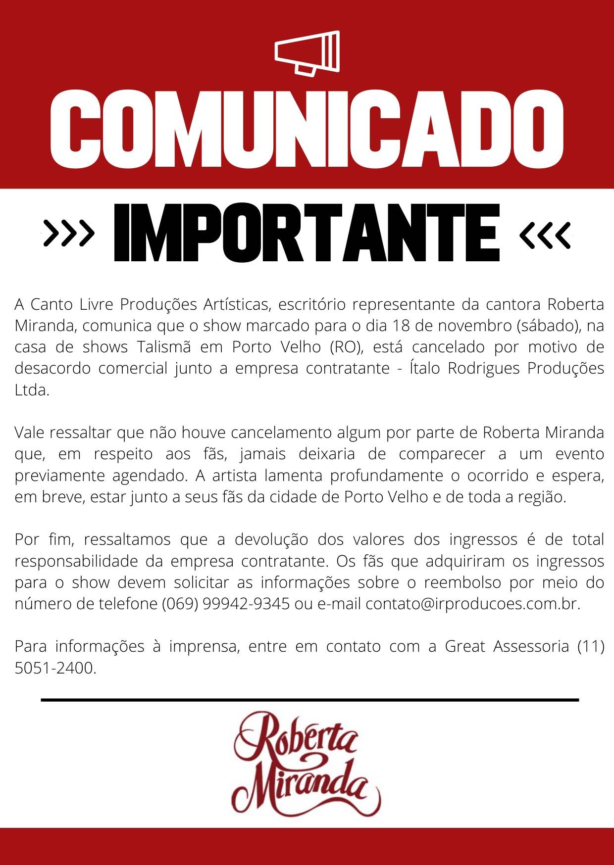 A Canto Livre Produções Artísticas, escritório representante da cantora Roberta Miranda, comunica que o show marcado para o dia 18 de novembro (sábado), na casa de shows Talismã em Porto Velho (RO), está cancelado por motivo de desacordo comercial junto a empresa contratante - Ítalo Rodrigues Produções Ltda.