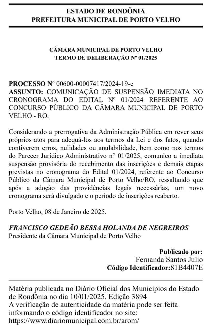 Porto Velho, RO – O concurso público da Câmara Municipal de Porto Velho, previsto para abrir inscrições nesta quarta-feira (10), foi suspenso por determinação do presidente do Legislativo Municipal, Francisco Gedeão Bessa Holanda de Negreiros. A decisão foi oficializada em ato publicado na mesma data, após a assessoria jurídica da Casa identificar erros no edital.