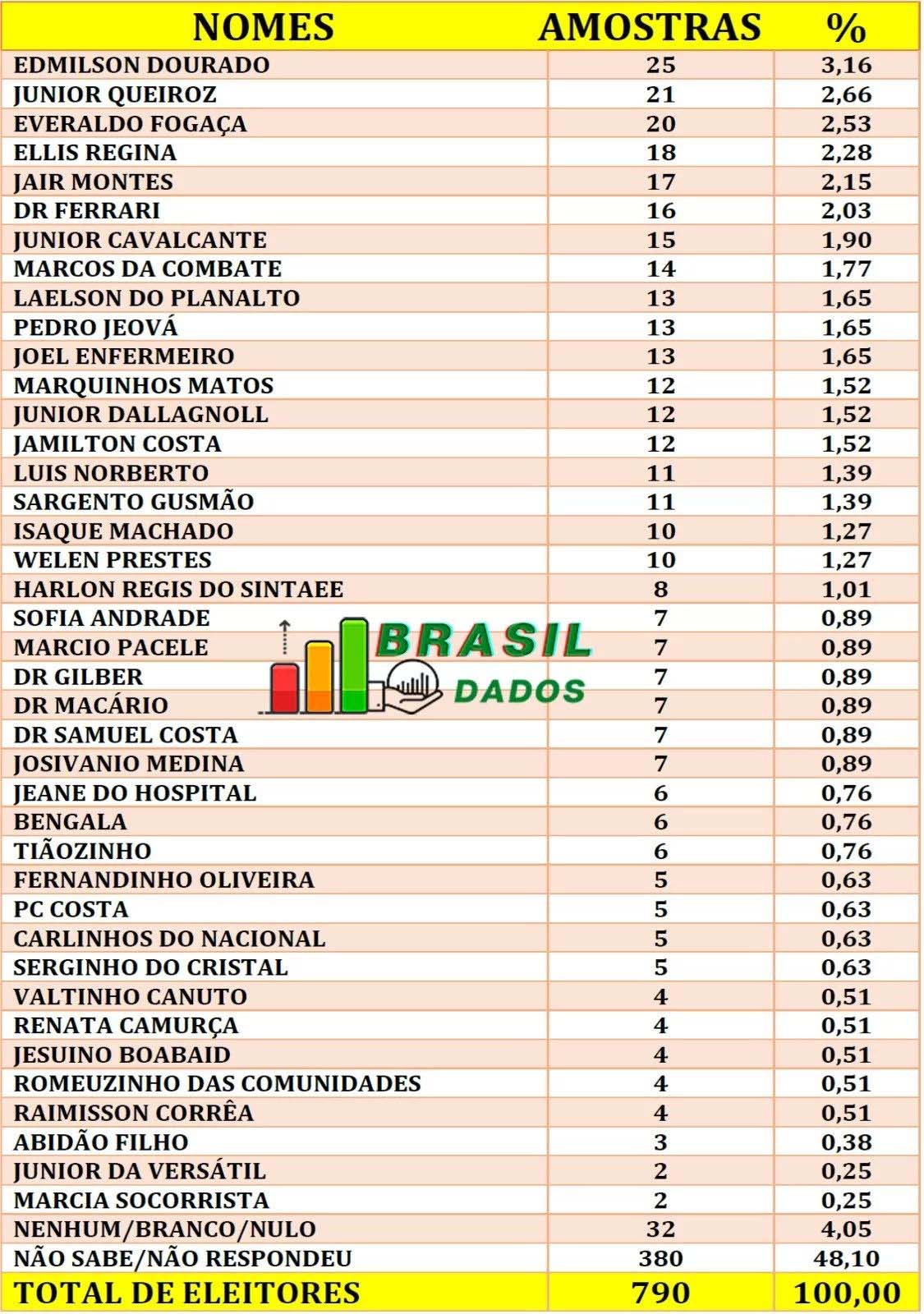 Segundo a pesquisa, se a eleição fosse hoje, as quatro primeiras colocações seriam ocupadas pelos vereadores Edmilson Dourado (3,16%), Junior Queiroz (2,66%), Everaldo Fogaça (2,53%) e Ellis Regina (2,28%). Na sequência aparecem o ex-vereador Jair Montes (2,15%), Dr. Ferrari (2,03%) e o ex-vereador Junior Cavalcante (1,90%).