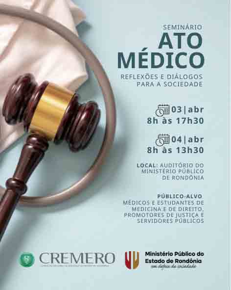 O Conselho Regional de Medicina do Estado de Rondônia (Cremero) em parceria com o Ministério Público do Estado de Rondônia (MPRO), com o apoio do Gaeciv e da Escola Superior do MPRO (Empro) realizará nos dias 03 e 04 de abril, o Seminário Ato Médico: Reflexões e Diálogos para a Sociedade.