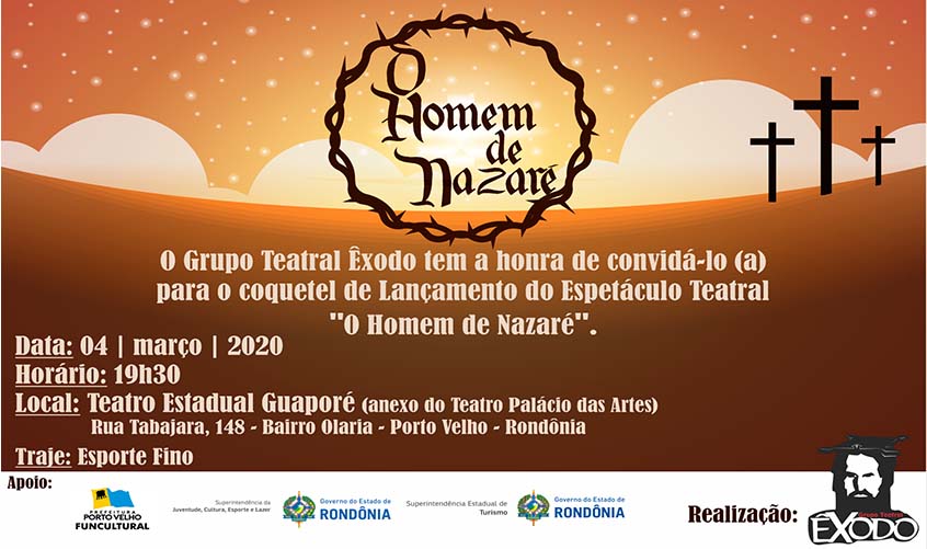 O Grupo Teatral Êxodo realiza no próximo dia 4 o Coquetel de Lançamento da edição 2020 do Espetáculo “O Homem de Nazaré”, considerado a maior encenação da Paixão de Cristo na Amazônia. O evento que acontece no Teatro Guaporé, em Porto Velho, às 19h30, é aberto ao público, inclusive com acessibilidade aos surdos, pois haverá tradução simultânea na linguagem de sinais, e contará com a presença de autoridades públicas, convidados, atores, membros das equipes técnica, de produção e direção, sócios do Grupo e religiosos cristãos.