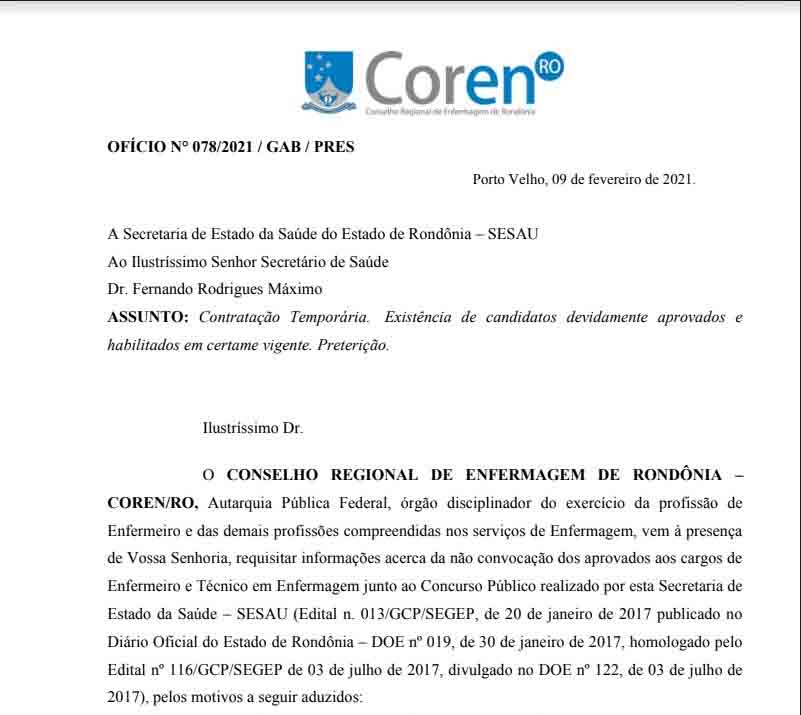 O Conselho Regional de Enfermagem de Rondônia (Coren-RO) encaminhou para a Secretaria Estadual de Saúde (Sesau), um ofício pedindo explicação sobre a não convocação dos candidatos aos cargos de enfermeiro e técnico em Enfermagem aprovados no concurso público de 2017.