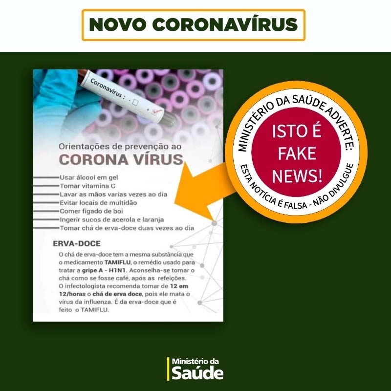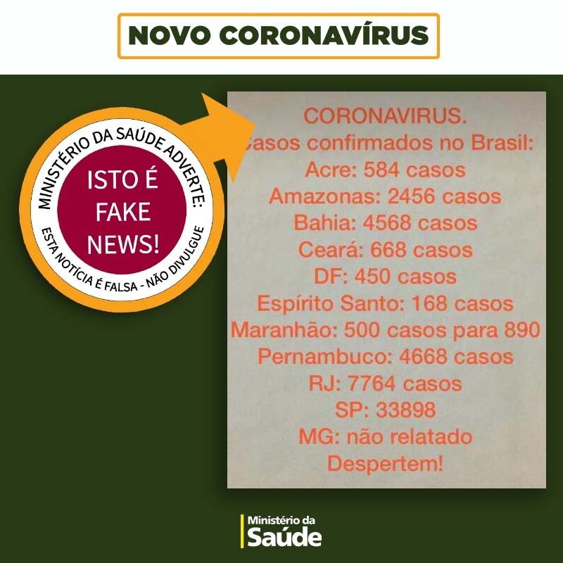 Depois da confirmação do primeiro caso de coronavírus no Brasil, as informações falsas, as chamadas fake news, têm se espalhado pelas redes sociais. O material é disseminado em formato de textos, imagens e vídeos e confunde a população, segundo as autoridades em saúde, sobre como se prevenir do novo coronavírus (COVID-19). Circula, inclusive, receitas mirabolantes de cura, que até o momento não foi encontrada pela ciência mundial.