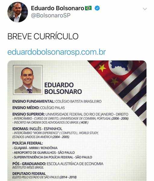 Cotado para assumir a Embaixada do Brasil em Washington, o deputado federal Eduardo Bolsonaro (PSL-SP) divulgou seu currículo nas redes sociais, para argumentar que está preparado para a função diplomática. A nomeação foi anunciada pelo pai do parlamentar, o presidente Jair Bolsonaro (PSL).