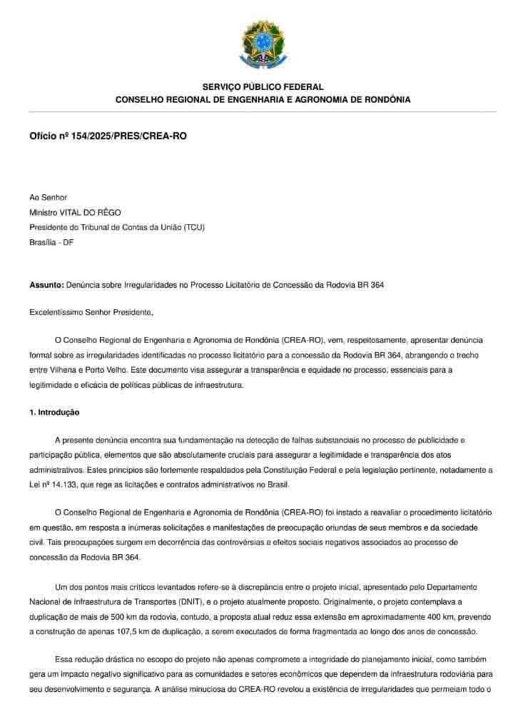 O Conselho Regional de Engenharia e Agronomia de Rondônia (CREA-RO) apresentou uma denúncia formal ao Ministério Público Federal (MPF) e ao Tribunal de Contas da União (TCU) contra o leilão de concessão da BR-364, que liga Porto Velho a outras regiões do estado. A ação visa impedir que o processo de leilão, considerando que as condições previstas para a melhoria da rodovia, a partir da concessão, são muito inferiores ao que estava inicialmente planejado pelo Departamento Nacional de Infraestrutura de Transportes (DNIT).