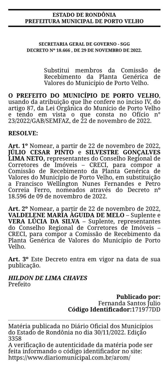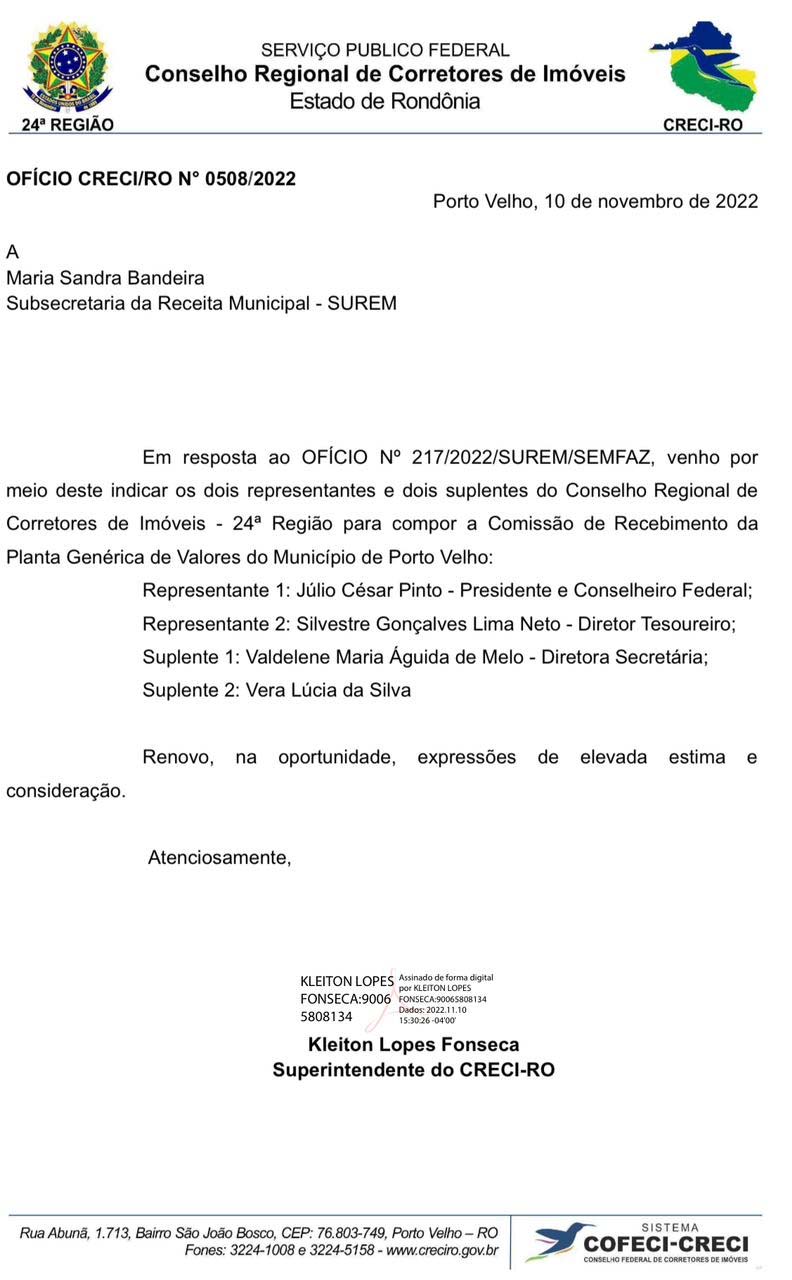 Porém, o presidente do CRECI/RO, Júlio César Pinto, toda a diretoria e conselheiros, esclarecem que não houve a participação da instituição nesse estudo, nem que durante essa gestão houve indicação de membros para comporem qualquer comissão na prefeitura para tratar deste assunto.