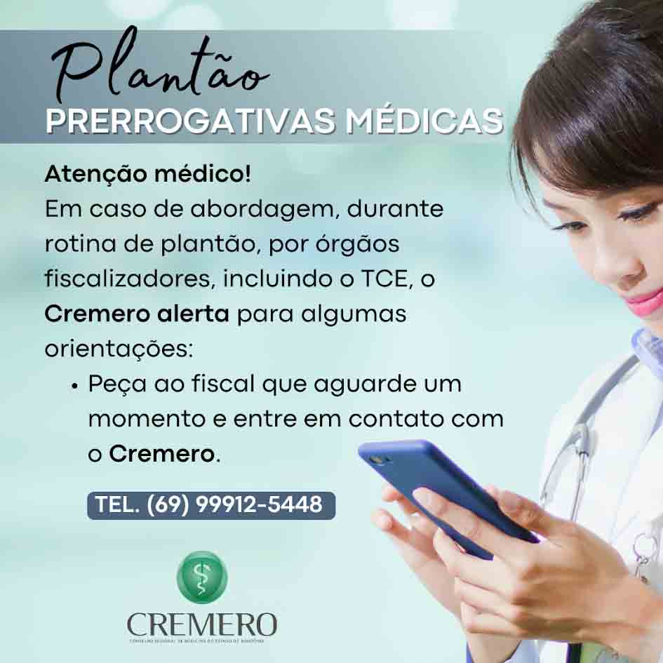 O Conselho Regional de Medicina do Estado de Rondônia (Cremero) implantou no último fim de semana o "Plantão Prerrogativas Médicas" para acompanhar os médicos durante a rotina de expediente dos mesmos quando são abordados por entidades fiscalizadoras. Uma escala entre o departamento de fiscalização do Conselho e diretoria está à disposição 24 horas por dia para acompanhar os profissionais em caso de abordagem que considerem importante a presença do órgão.