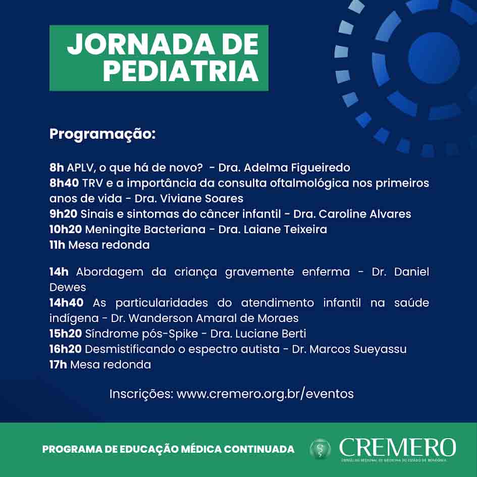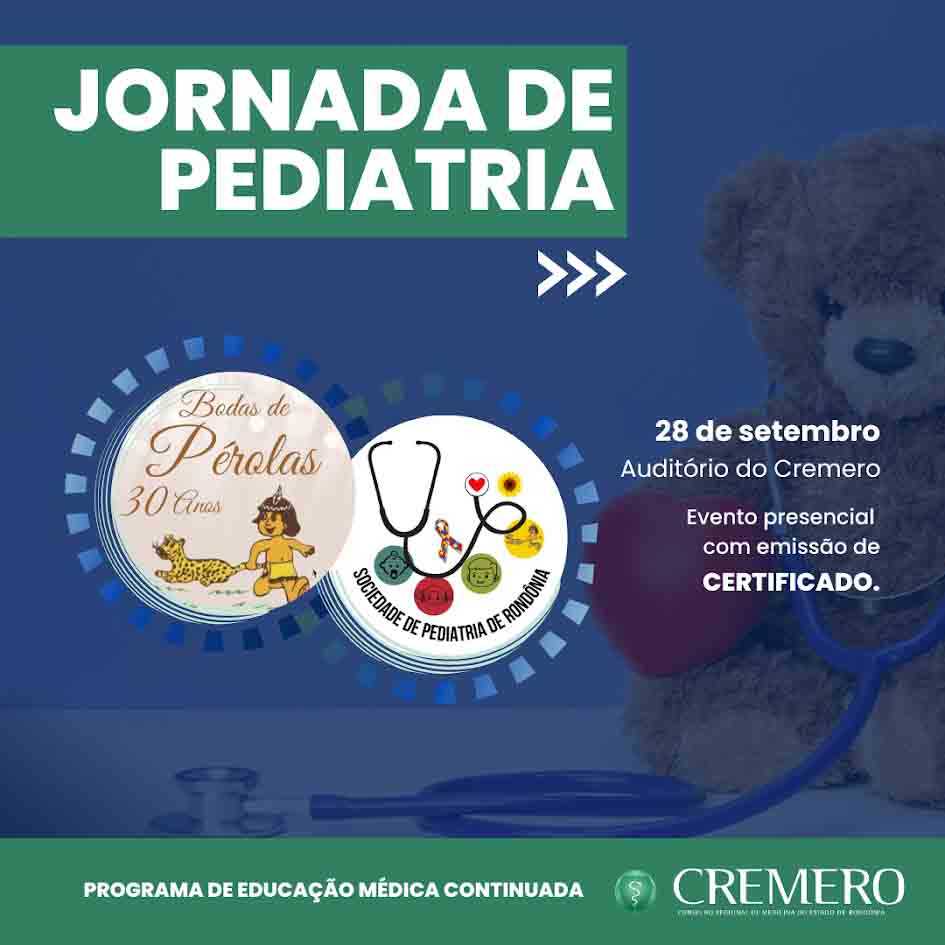 O Conselho Regional de Medicina do Estado de Rondônia (Cremero) e a Sociedade de Pediatria de Rondônia (Sopero) realizam no próximo dia 28 de setembro a Jornada de Pediatria em comemoração aos 30 anos da entidade no Estado. O evento acontecerá de forma presencial no auditório do Cremero, em Porto Velho.