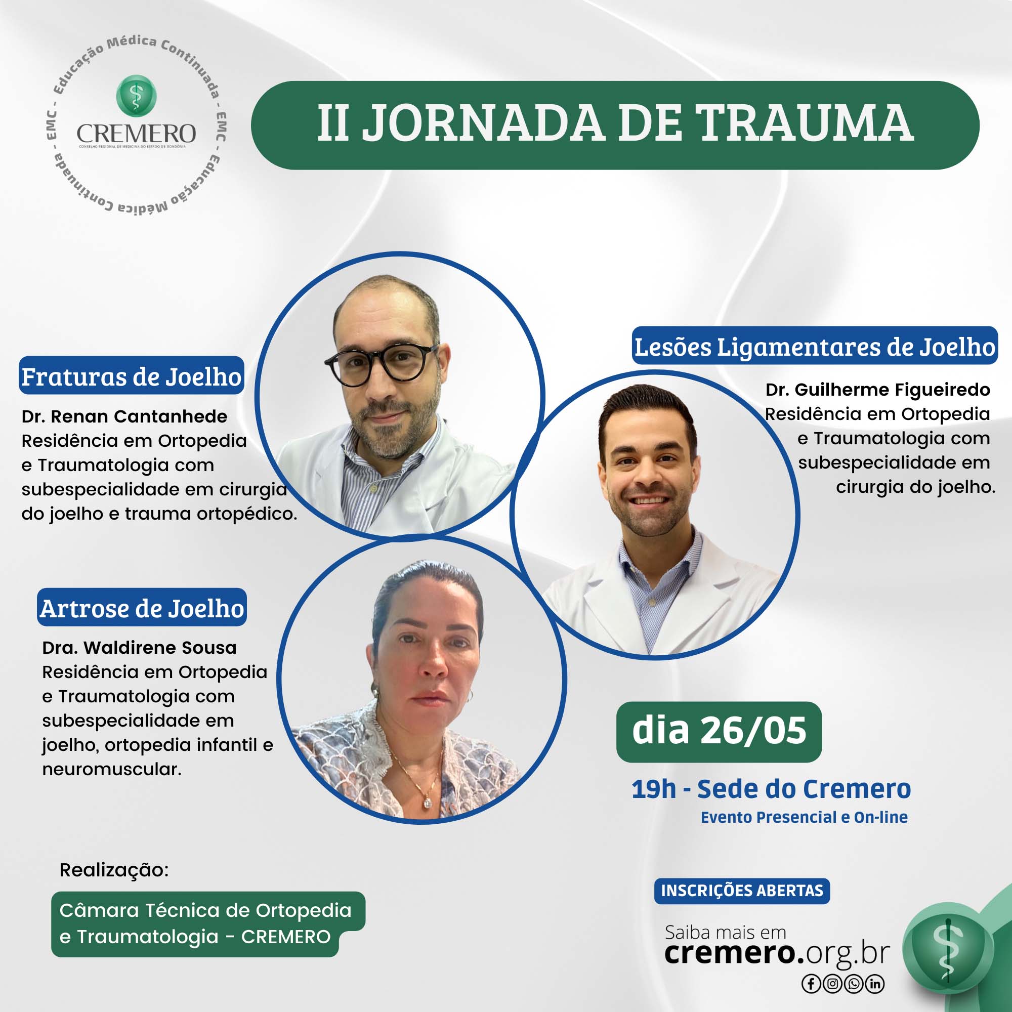 O Conselho Regional de Medicina do Estado de Rondônia (Cremero), através da Câmara Técnica de Ortopedia e Traumatologia, realiza no dia 26 de maio, a partir das 19h, a II Jornada de Trauma. Com a abordagem central sobre “Joelho”, a organização considera uma demanda significativa da especialidade no Estado e de importante relevância para ser tema de capacitação para alunos de medicina e profissionais da área.