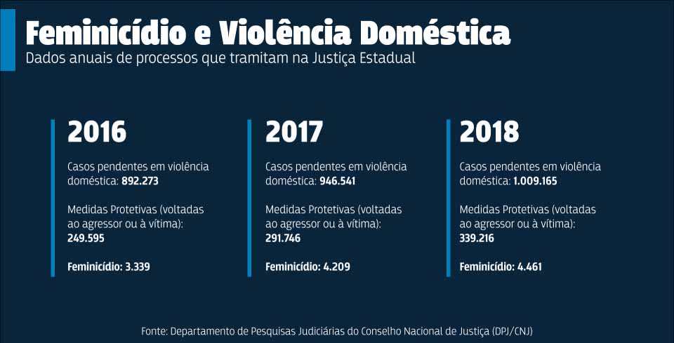 Os tribunais de Justiça também perceberam crescimento no número de processos pendentes relativos à violência contra a mulher. Em 2016, havia quase 892 mil ações aguardando decisão da Justiça. Dois anos depois, esse número cresceu 13%, superando a marca de um milhão de casos. Os dados dos tribunais foram consolidados pelo Departamento de Pesquisas Judiciárias (DPJ/CNJ).