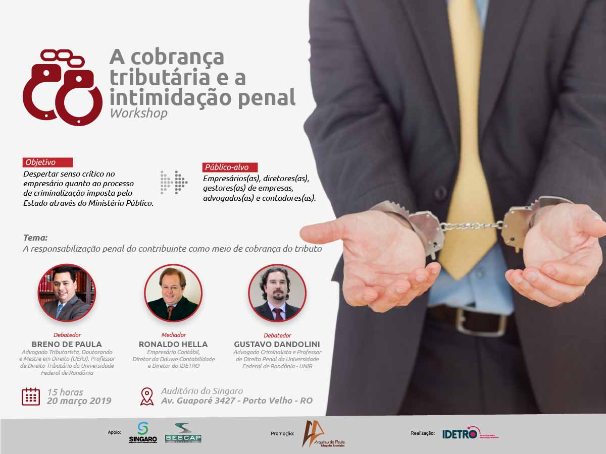 Para ajudar o contribuinte a entender melhor como proceder em casos como este, o Instituto de Direito Tributário do Estado de Rondônia (Idetro) realizará o workshop: “A cobrança tributária e a intimidação penal”. O evento acontecerá no próximo dia 20 de março, às 15 horas, no auditório do Singaro, em Porto Velho. A participação no evento é gratuita, restam poucas vagas e as inscrições podem ser feitas através do link: https://doity.com.br/a-cobranca-tributaria-e-a-intimidacao-penal