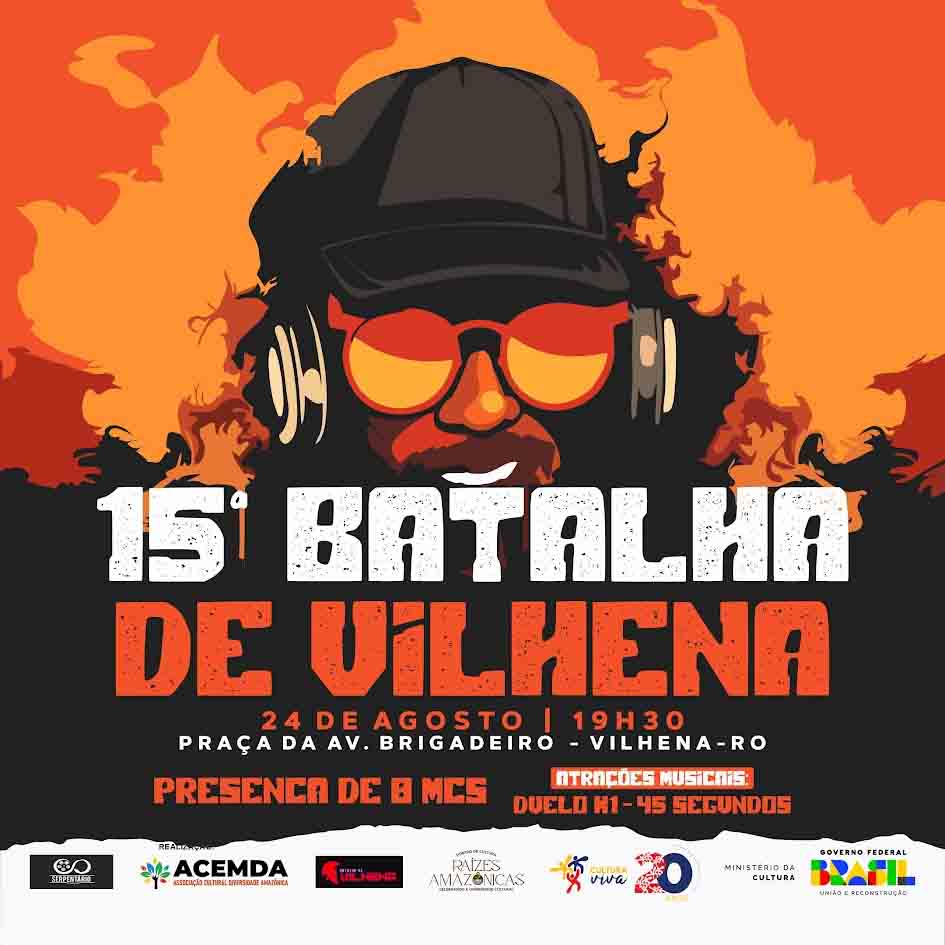 No sábado, 24 de agosto, Vilhena (RO) será palco de um dos eventos mais aguardados da cena cultural local: a 15ª edição da Batalha de Vilhena. Este evento, que já se consolidou como um marco na expressão da cultura hip hop na cidade, será realizado a partir das 19h30 na Praça da Avenida Brigadeiro. Nesta edição, o evento conta com o apoio do Pontão de Cultura Raízes Amazônicas: Celebrando a Diversidade Cultural em parceria com o Ponto de Cultura e Mídia Livre Serpentário Produções.