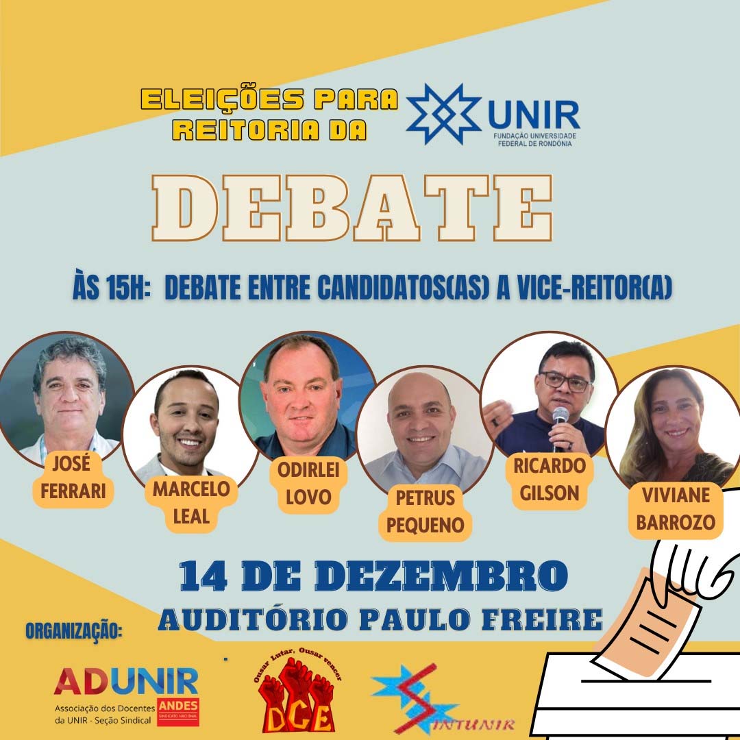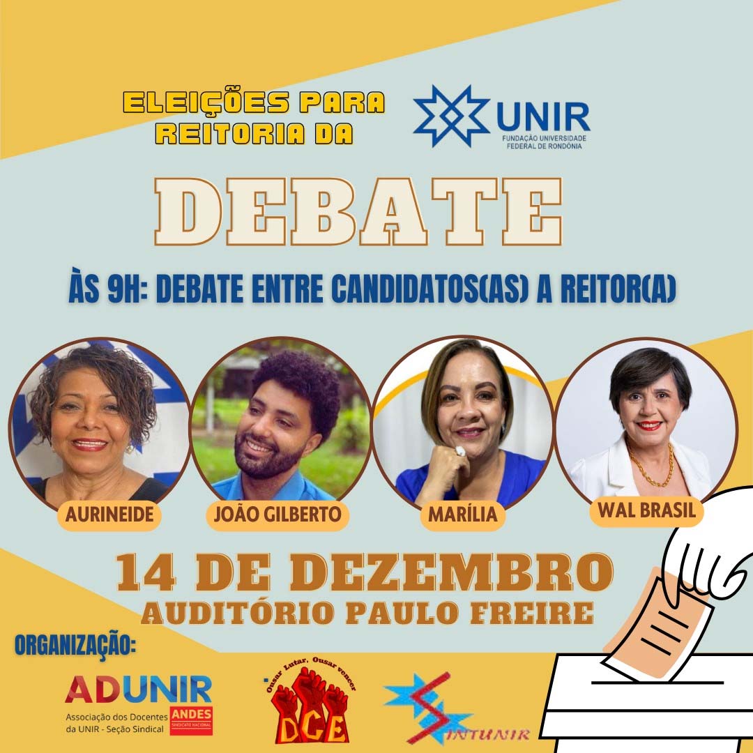 A Associação dos Docentes da Universidade Federal de Rondônia (ADUNIR), juntamente com o Diretório Central dos Estudantes (DCE) e o Sindicato dos Trabalhadores em Educação da UNIR (SINTUNIR) realizam nessa quinta-feira, 14, no auditório Paulo Freire, no campus da UNIR em Porto (BR 364 – sendo Acre), dois debates com os candidato(a)s ao cargo de reitor(a) pela parte da manhã das 9h às12h, e a tarde das 15h às-17h com o(a)s candidatos ao cargo de vice-reitoria, o debate também será transmitido pelo youtube. Os eleitos cumprirão o mandato para o quadriênio de 2024-2028