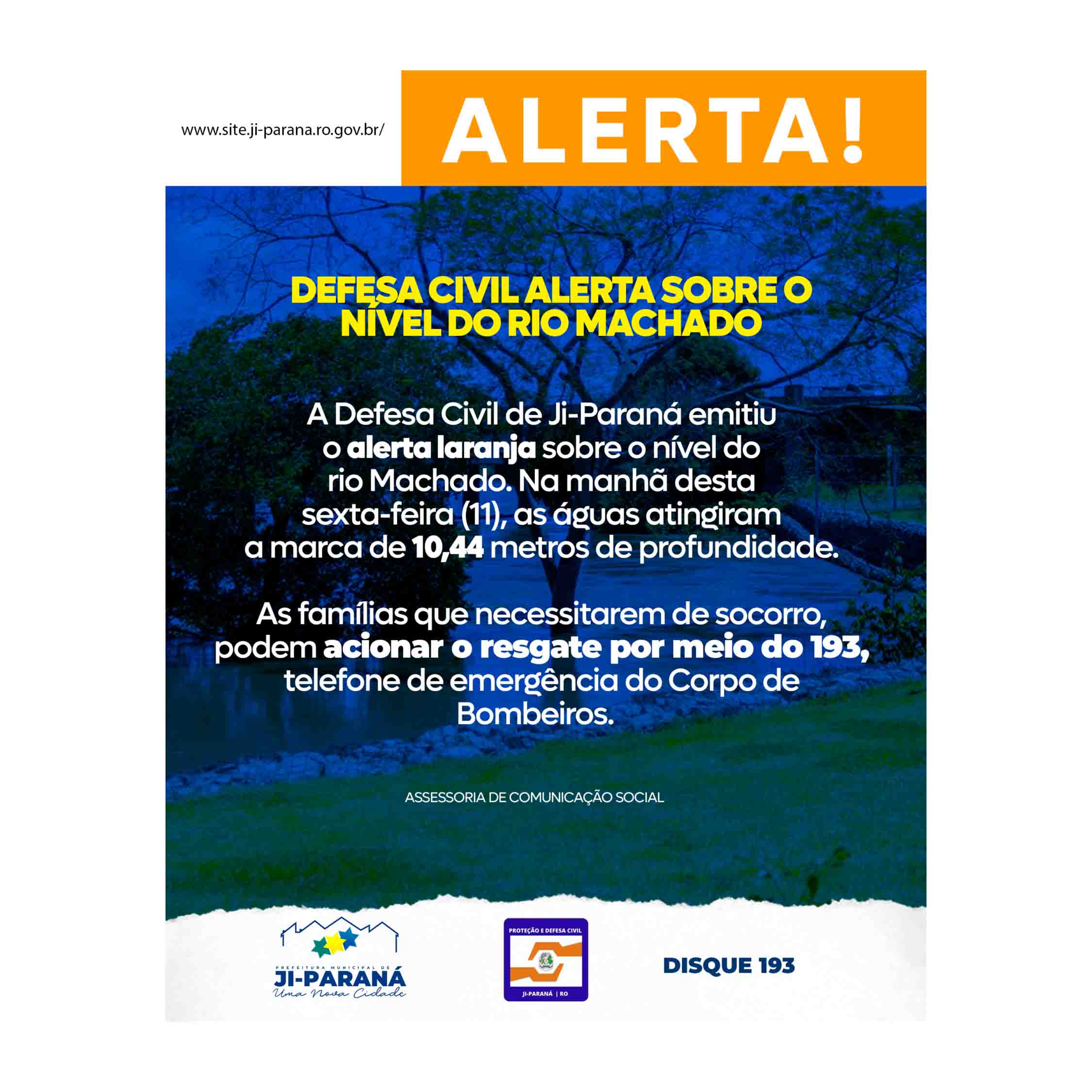 A Defesa Civil de Ji-Paraná emitiu o alerta laranja sobre o nível do rio Machado. Na manhã desta sexta-feira (11), as águas atingiram a marca de 10,44 metros de profundidade, segundo o acompanhamento em tempo real realizado pela Agência Nacional das Águas (ANA).