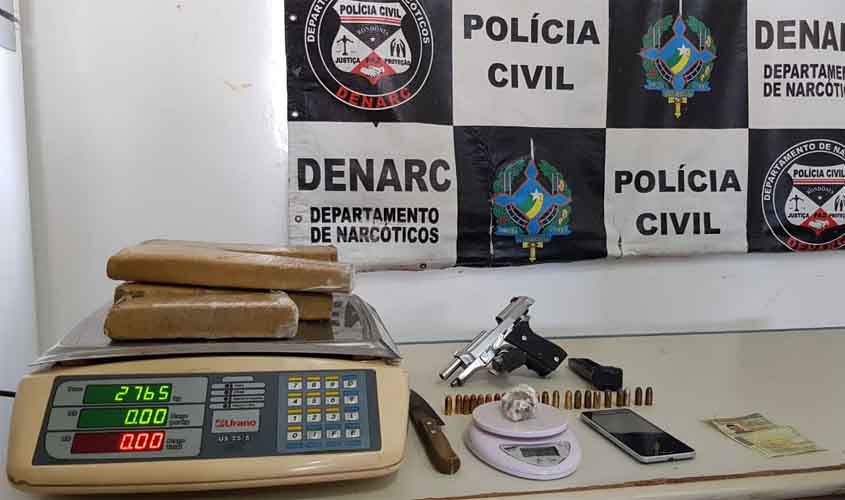 Durante diligências, os policiais civis encontraram, no interior da casa, quase três quilos de maconha, uma pistola calibre 380 com dois carregadores municiados e uma balança de precisão para poder pesar o entorpecente para a comercialização.