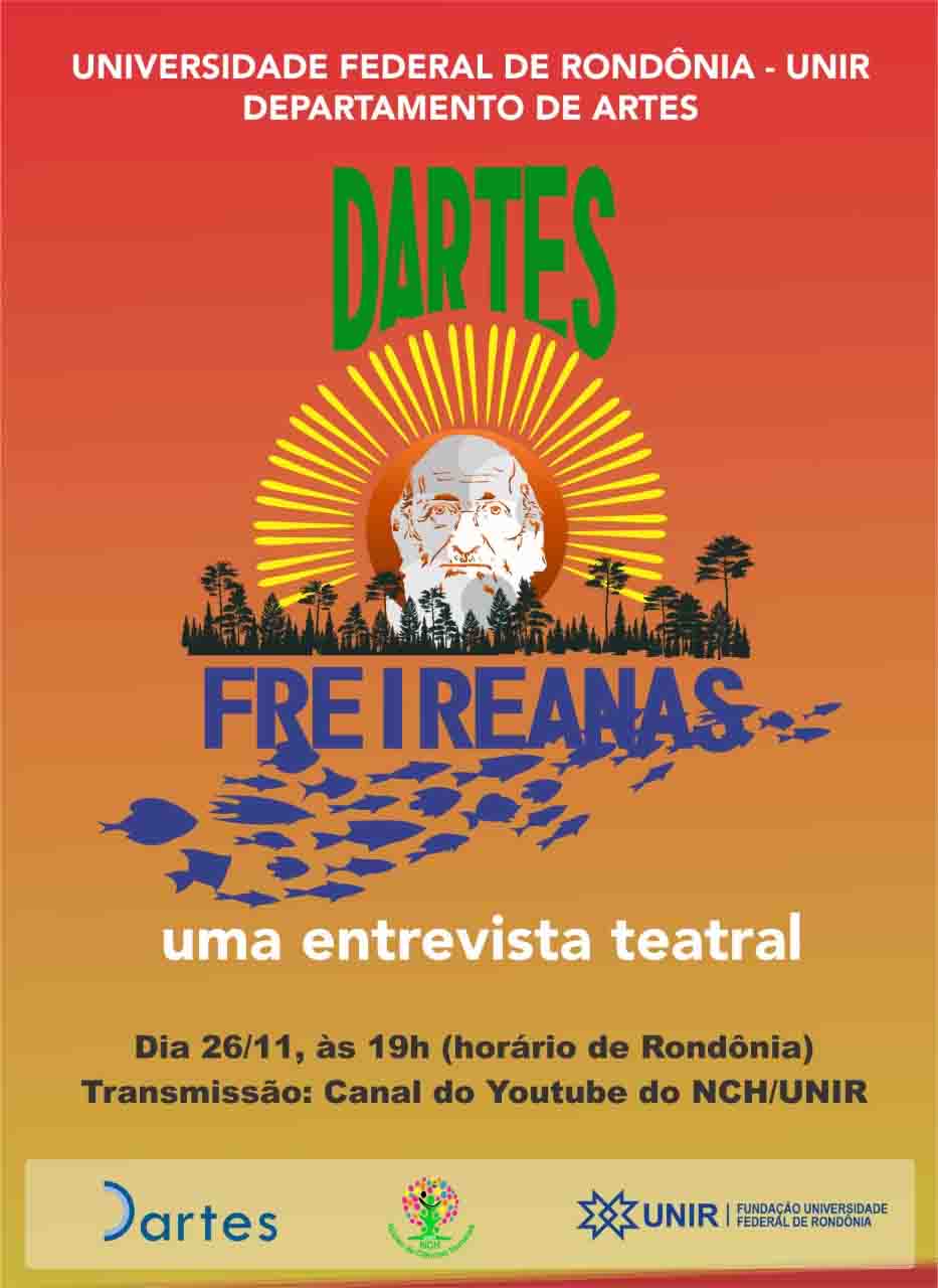 O Departamento de Artes (DArtes) da Fundação Universidade Federal de Rondônia (UNIR) celebra o centenário de nascimento do intelectual brasileiro mais lido no mundo, dentro da programação do evento Paulo Freire, 100!, organizado pelo Núcleo de Ciências Humanas (NCH). No dia 26/11, às 19 horas, pelo canal do Youtube do NCH, um grupo de estudantes e docentes dos cursos de Artes Visuais, Música e Teatro apresentará a leitura dramatizada intitulada “DArtes Freireanas: uma entrevista teatral”.