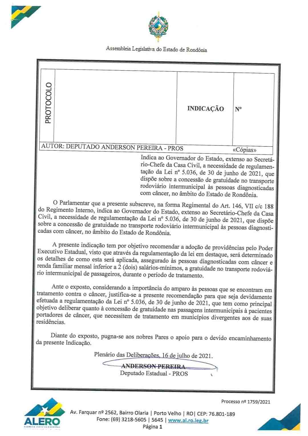 O deputado estadual Anderson Pereira (PROS), autor da Lei nº 5.036/2021, que concede passe livre no transporte rodoviário intermunicipal às pessoas com diagnóstico de câncer, enviou ao Poder Executivo, com cópia à Casa Civil, indicação solicitando a necessidade de imediata regulamentação, para atender os pacientes no âmbito do estado de Rondônia.
