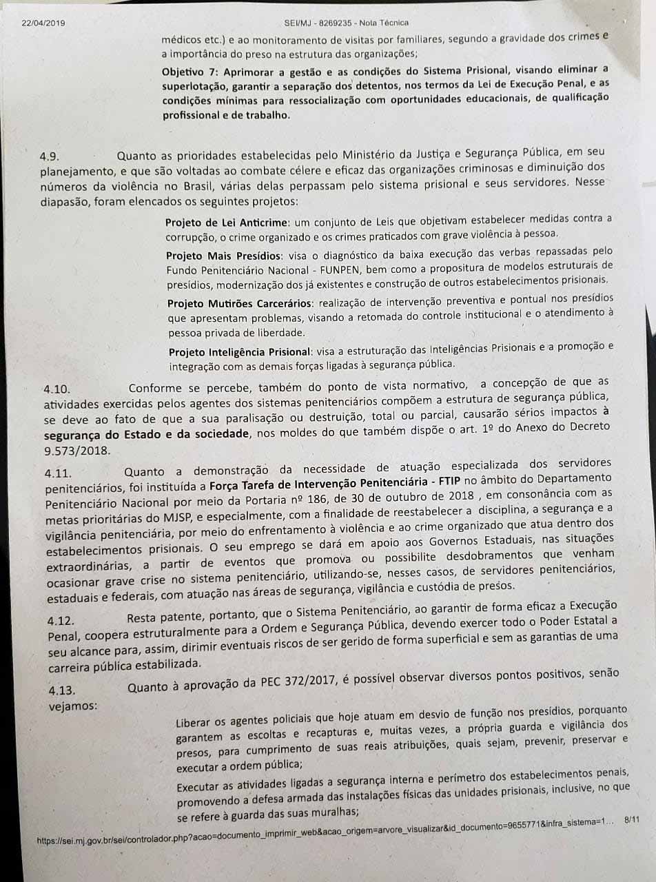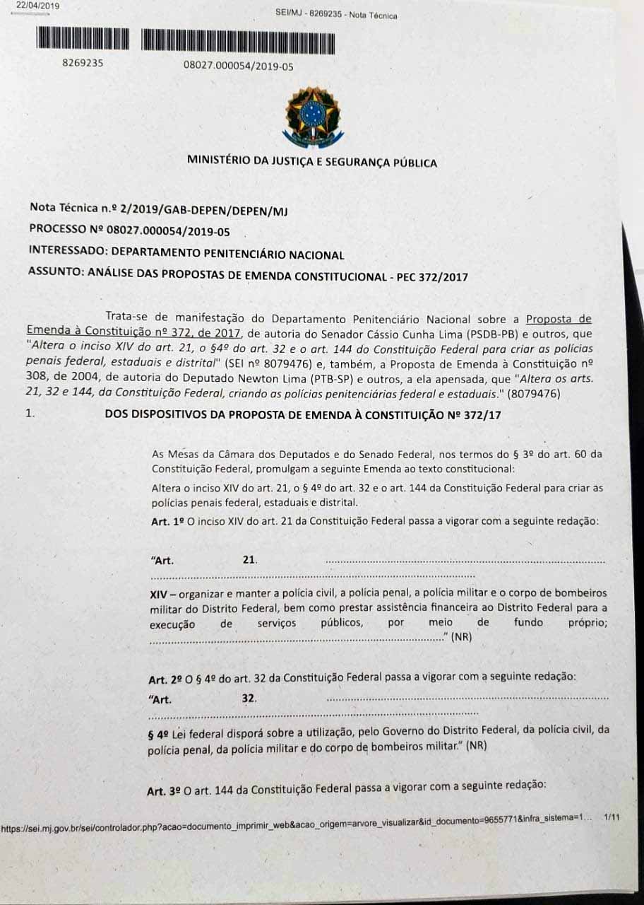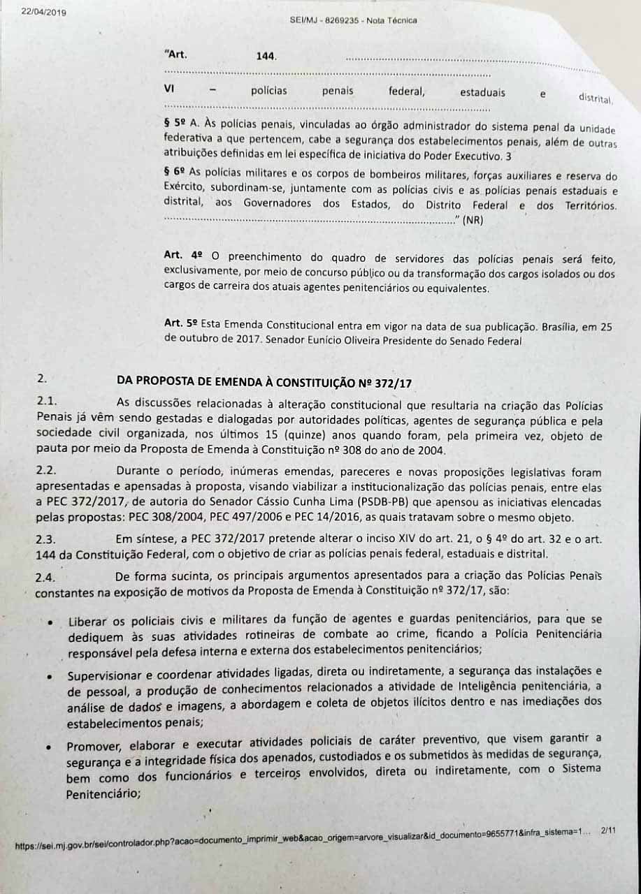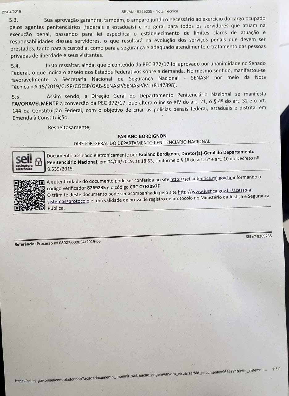 Segundo a nota, a aprovação da PEC, que é discutida há 15 anos, atenderá o aperfeiçoamento dos serviços penitenciários e da segurança pública, no combate ao crime organizado e redução dos índices relacionados à violência no Brasil. “A medida reforça a relevante função de segurança pública exercida pelos servidores prisionais e a responsabilidade crescente destes profissionais na gestão da segurança prisional”, registra o documento assinado por Bordignon, que é delegado de carreira da Polícia Federal.