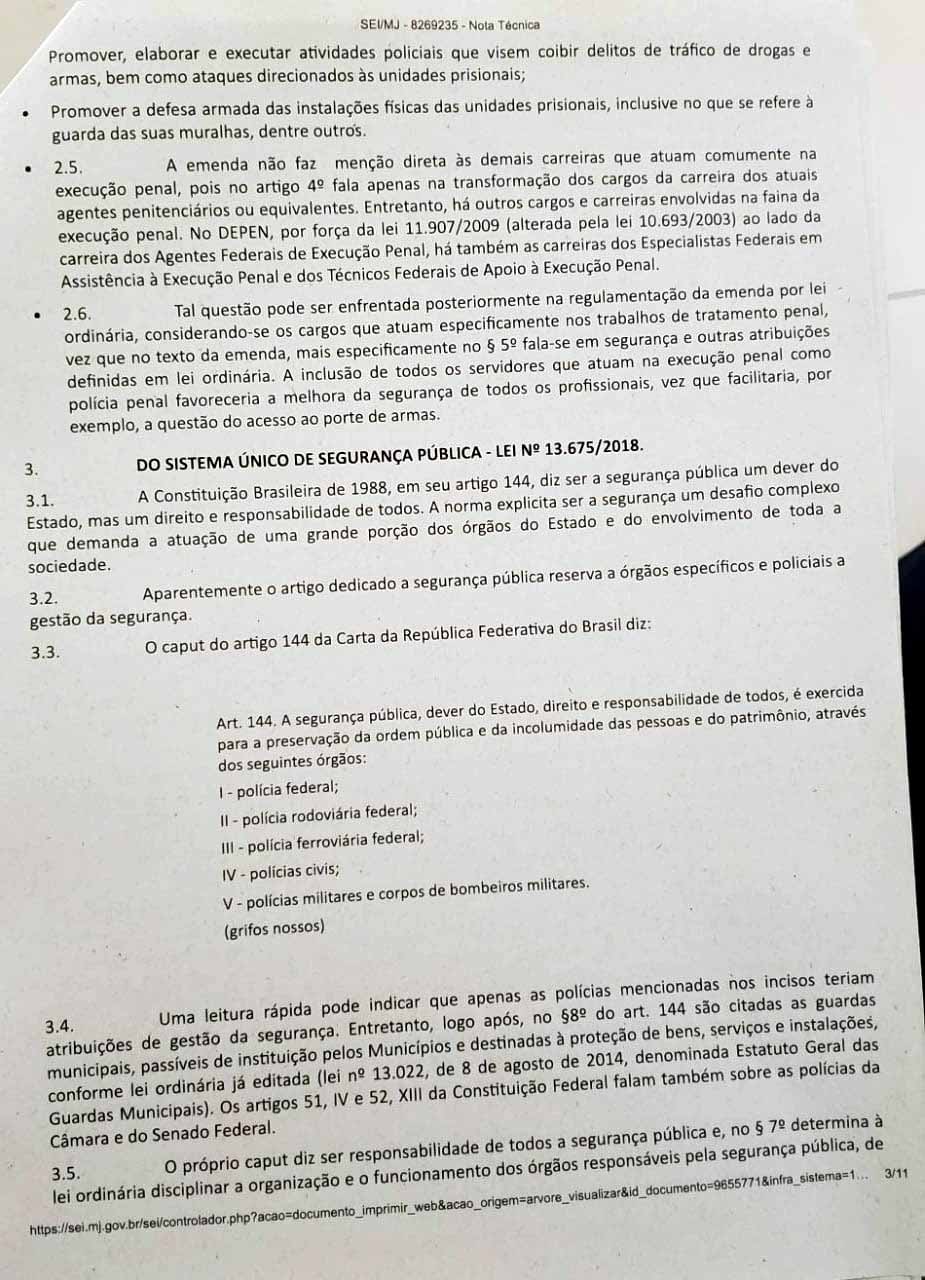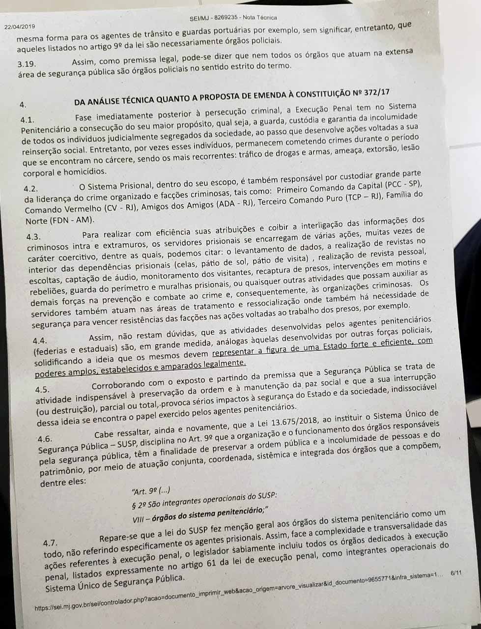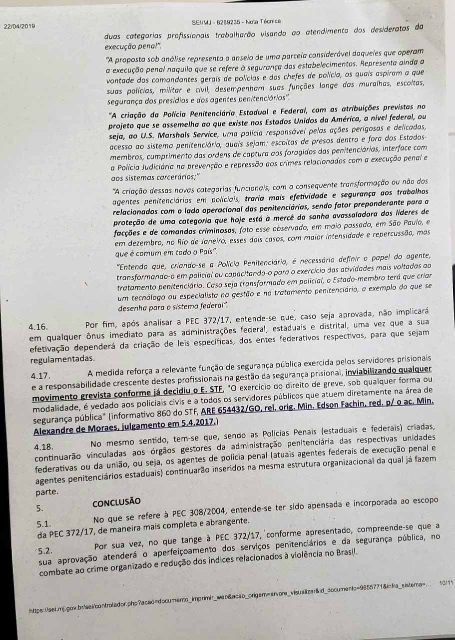 Segundo a nota, a aprovação da PEC, que é discutida há 15 anos, atenderá o aperfeiçoamento dos serviços penitenciários e da segurança pública, no combate ao crime organizado e redução dos índices relacionados à violência no Brasil. “A medida reforça a relevante função de segurança pública exercida pelos servidores prisionais e a responsabilidade crescente destes profissionais na gestão da segurança prisional”, registra o documento assinado por Bordignon, que é delegado de carreira da Polícia Federal.