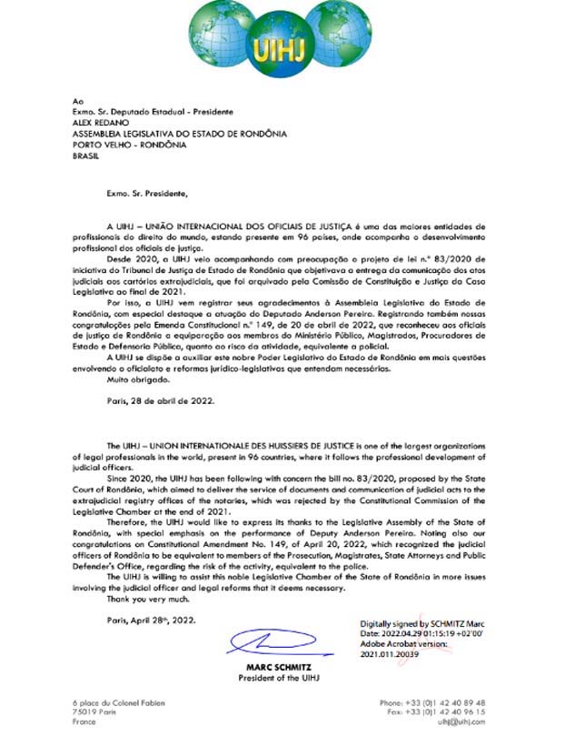 A União Internacional dos Oficiais de Justiça – UIHJ, com sede em Paris, na França, encaminhou um ofício de agradecimento direcionado ao presidente da Assembleia Legislativa, deputado Alex Redano (Republicanos), com especial destaque a atuação do deputado Anderson Pereira, pela Emenda Constitucional n.º 149, de 20 de abril de 2022, que reconheceu aos oficiais de justiça de Rondônia a equiparação aos membros do Ministério Público, Magistrados, Procuradores de Estado e Defensoria Pública, quanto ao risco da atividade, equivalente a policial.