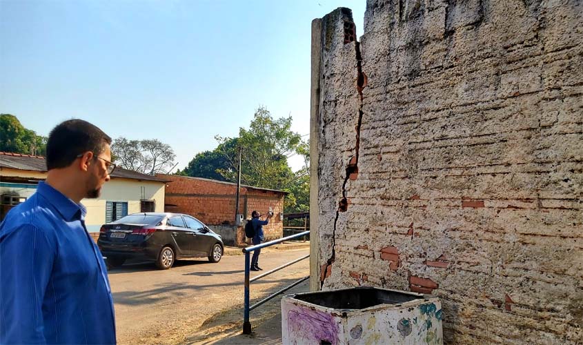 Na escola do bairro Nacional, o parlamentar se deparou com uma situação muito crítica que oferece sérios riscos aos alunos, professores e comunidade, o muro da instituição ameaça desabar, devido ao terreno inclinado e também por apresentar rachaduras causadas pelo crescimento da raiz de um jambeiro.