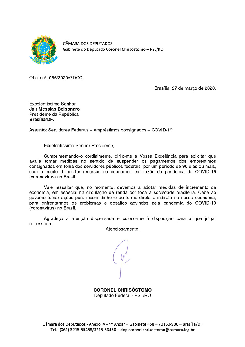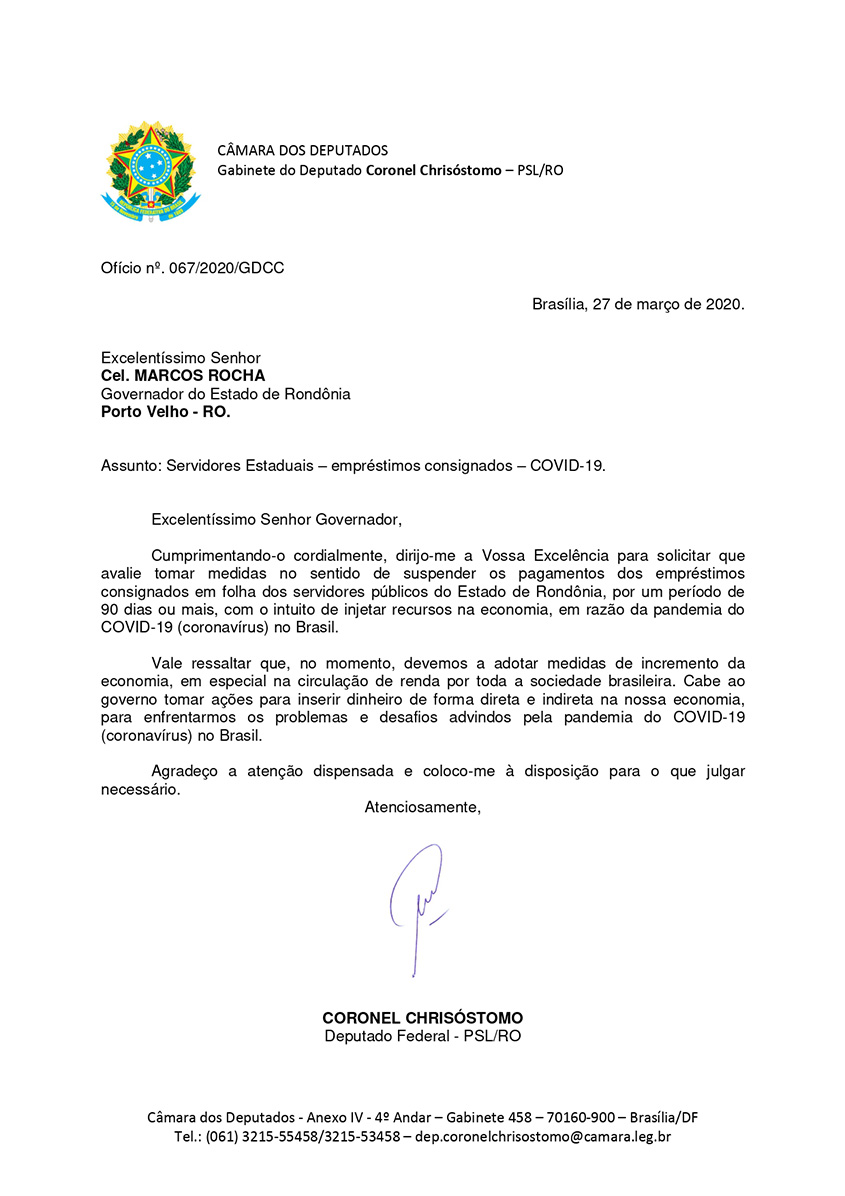 O deputado federal Coronel Chrisóstomo (PSL-RO) enviou, nesta sexta (27.03), documento oficial ao presidente Jair Bolsonaro assim como ao governador de Rondônia, Marcos Rocha, solicitando medidas no sentido de suspender os descontos em folha aos servidores federais e estaduais, por empréstimos consignados.