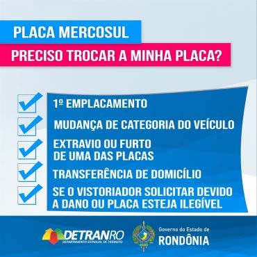 Atendendo à Resolução nº 780/19 do Conselho Nacional de Trânsito (Contran), o Departamento Estadual de Trânsito (Detran) Rondônia informa que na próxima segunda-feira (2) entra em vigor em Rondônia a nova Placa de Identificação Veicular (PIV) – Padrão Mercosul.