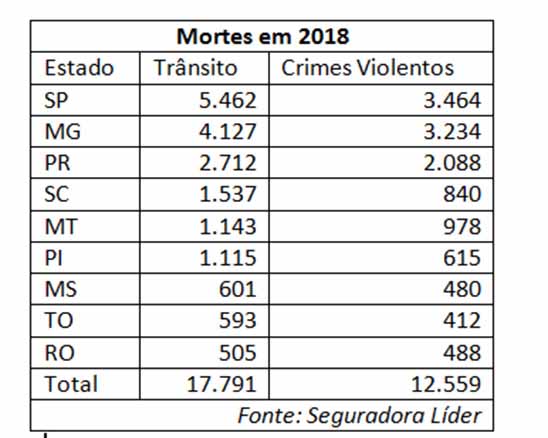 São Paulo registrou 5.462 sinistros por acidentes fatais no trânsito contra 3.464 óbitos por crimes violentos. Seguem-se: Minas Gerais, Paraná, Santa Catarina, Mato Grosso, Piauí, Mato Grosso do Sul, Tocantins e Rondônia, onde também ocorreram mais mortes por acidentes de trânsito do que por outros crimes violentos.