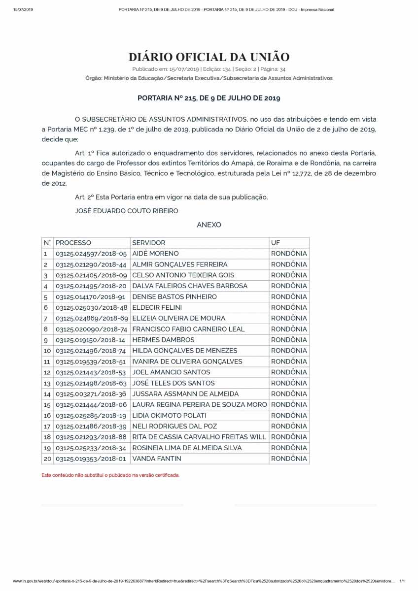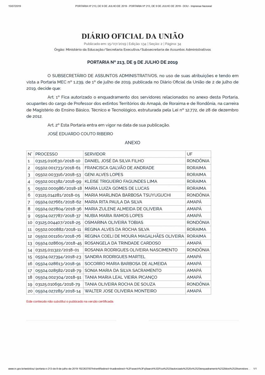 O Diário Oficial da União divulgou nos dias 12 e 15 de julho, novas Portarias enquadrando mais de 150 professores de Rondônia na Carreira de Magistério do Ensino Básico Técnico e Tecnológico (EBTT).