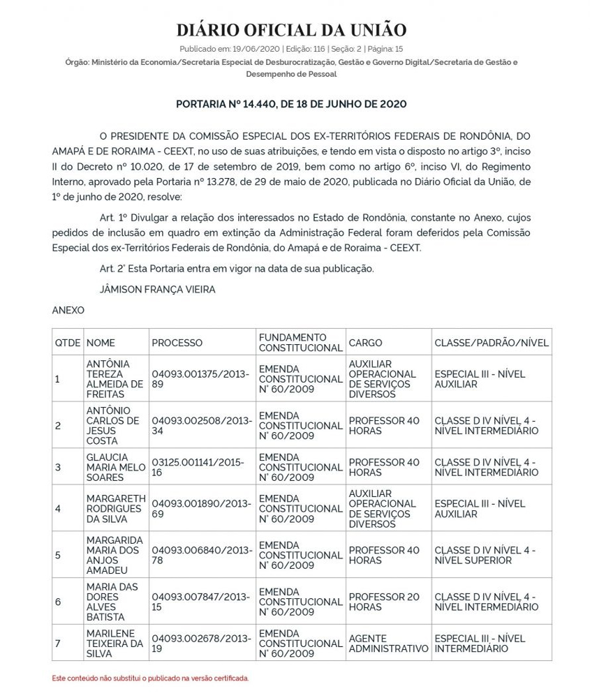 O Diário Oficial da União publicou a Portaria nº 14.440, beneficiando 7 servidores de Rondônia com a Transposição. Esses servidores passarão a receber pela folha federal, após enquadramento.