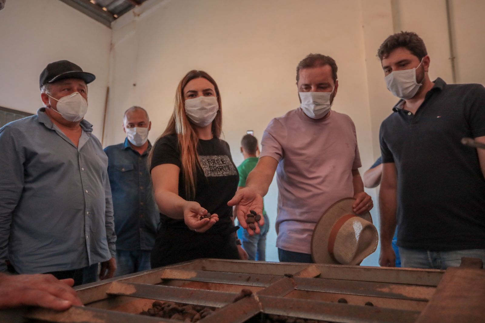 O prefeito e sua comitiva puderam ver de perto o processo de extração do óleo de cupuaçu, que depois de processado tem como um dos principais destinos empresas de cosméticos como a Natura.