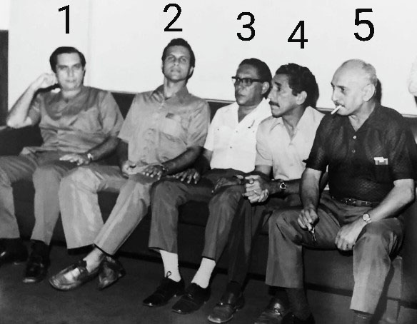 Dr. Jacob Freitas Atallah, médico e Secretário de Saúde (1); Ney Simões Barbosa, administrador e jogador de futebol (2); Newton Azevedo, Diretor Administrativo do Palácio Presidente Vargas (3); Capitão Nélio Guimarães, Oficial da Guarda Territorial (4) e meu saudoso pai Anísio Gorayeb, Presidente da Caerd (5).