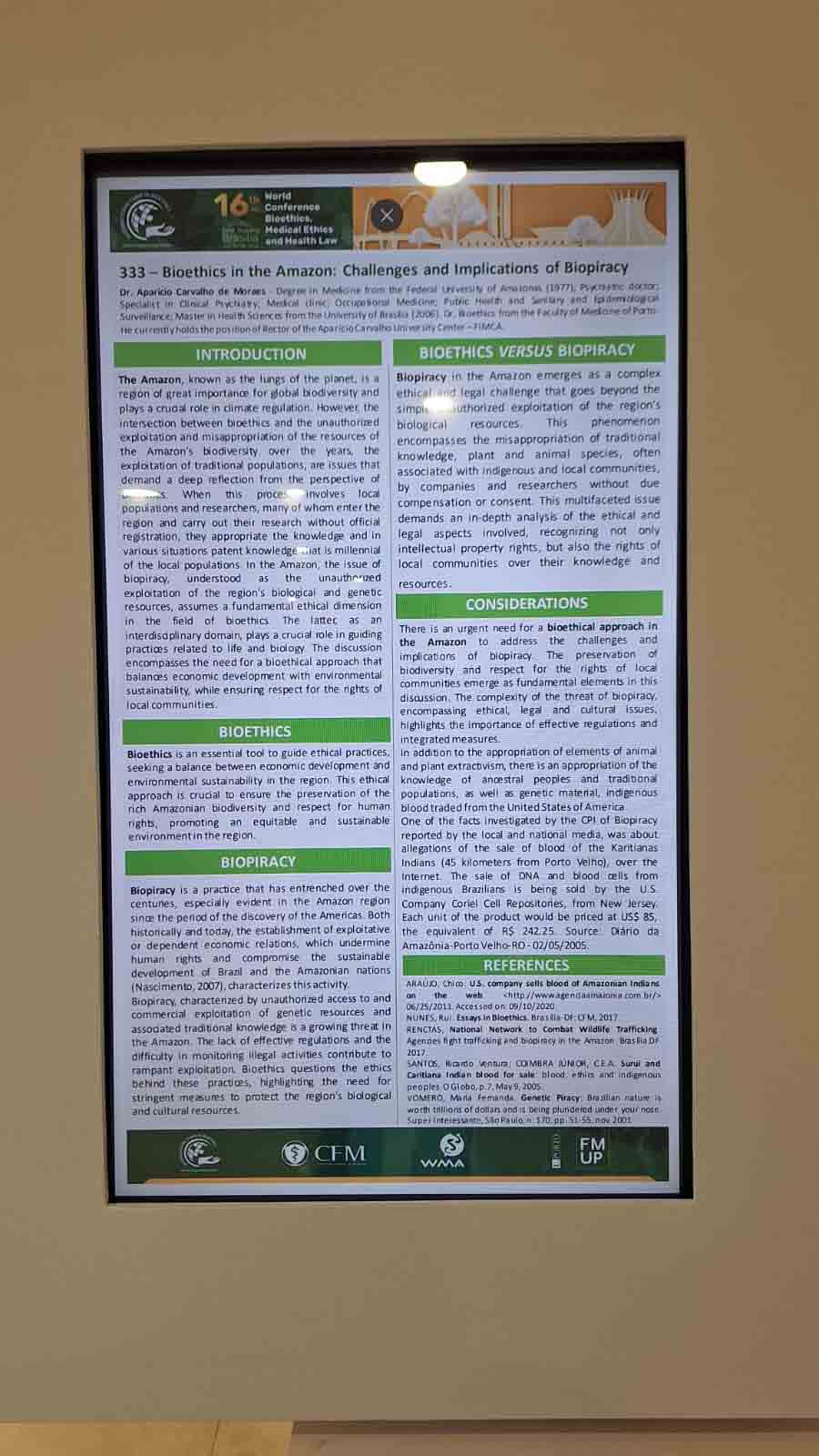 O Dr. Aparício Carvalho, presidente do Grupo Educacional Aparício Carvalho, participou da 16th World Conference on Bioethics, Medical Ethics and Health Law, realizada no Conselho Federal de Medicina – CFM em Brasília no período de 24 à 26 de julho, com apresentação de trabalho acadêmico no formato de pôster, com o tema: Bioethics in the Amazon: Challenges and Implications of Biopiracy. Este evento internacional, que reúne especialistas de diversas áreas da saúde e das ciências humanas, serviu como uma plataforma para a troca de conhecimentos e a discussão de temas cruciais relacionados à bioética e à ética médica.