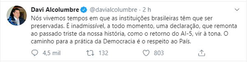 O presidente do Senado, Davi Alcolumbre, lamentou no Twitter nesta quarta-feira (27) a declaração do ministro da Economia, Paulo Guedes, sobre a possível edição de um novo AI-5 (Ato Institucional número 5, de dezembro de 1968, que suspendeu garantias constitucionais e aprofundou a ditadura militar no país) em caso de mobilizações sociais.