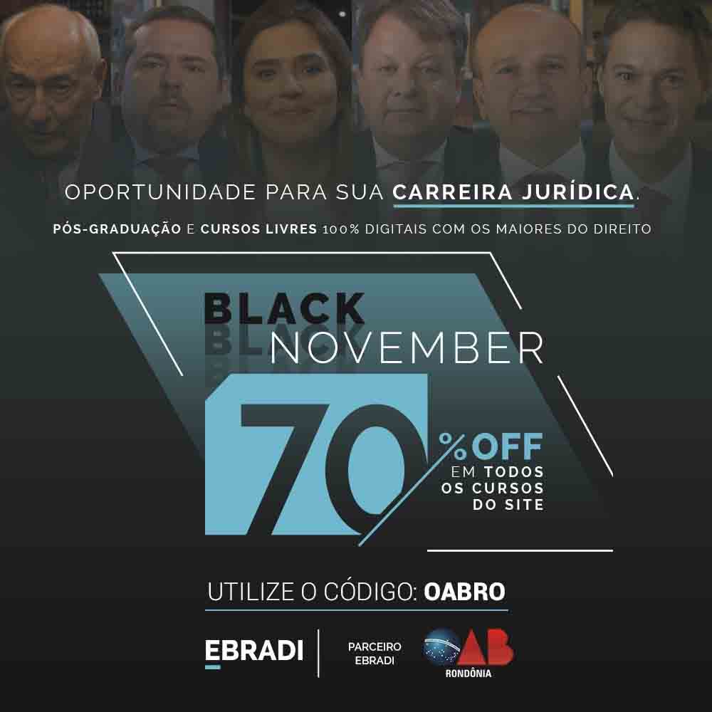 Em uma ação de Black-November, a Escola Brasileira de Direito (Ebradi) oferece desconto de 70% em qualquer curso do site (www.ebradi.com.br/oabro), em parceria com a OAB Rondônia. O benefício pode ser acessado com o código OABRO na hora da aquisição.