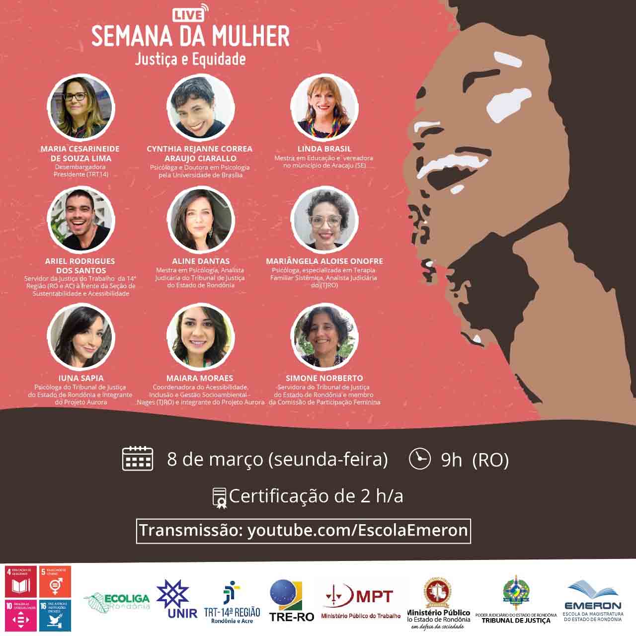 A Ecoliga-Rondônia, rede de cooperação e colaboração entre órgãos públicos, promoverá, nos dias 8 e 10 de março de 2021, a Semana da Mulher: Justiça e Equidade, evento alusivo ao Dia Internacional da Mulher. Em dois dias, serão promovidos diversos debates com o objetivo de ampliar o diálogo com a sociedade sobre temas relevantes na luta feminina.