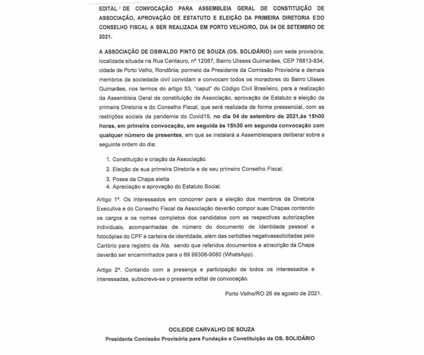 EDITAL DE CONVOCAÇÃO - Assembleia Geral de Constituição, Aprovação de Estatuto, Eleição de Diretoria e Conselho Fiscal da Associação Oswaldo Pinto de Souza