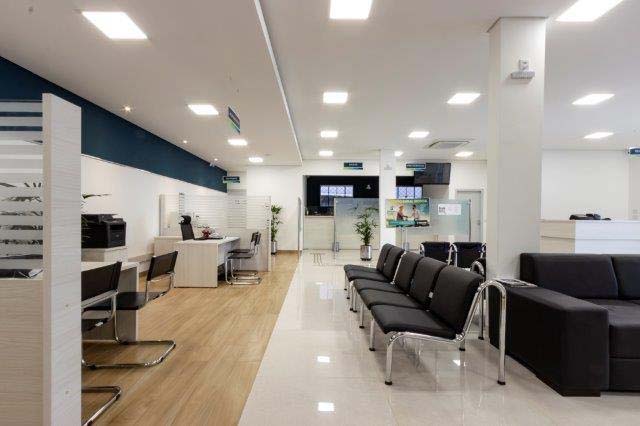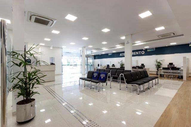 O atendimento pessoal foi posto em L, usando um piso tipo régua amadeirado que confere conforto e aconchego. Os proprietários precisavam reformar o espaço, organizando-o e deixando-o funcional. A paginação do porcelanato de madeira, ajudou a destacar e valorizar o ambiente e acabou sendo utilizado como padrão em todas as outras agências.