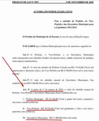 O reajuste de salário do autor da proposta é ainda mais escandaloso: Joaquim Teixeira salta de R$ 9.100,00 para R$ 20.526,48 (137% de aumento). Secretários municipais vão dos atuais R$ 9.100,00 para R$ 11 mil (11,9% a mais) e os vereadores sobem de R$ 9.031,50 também para R$ 11 mil (disparada de 55,5%).