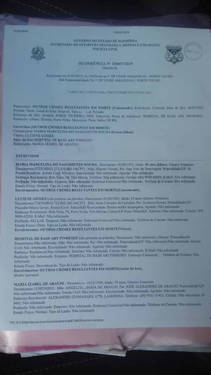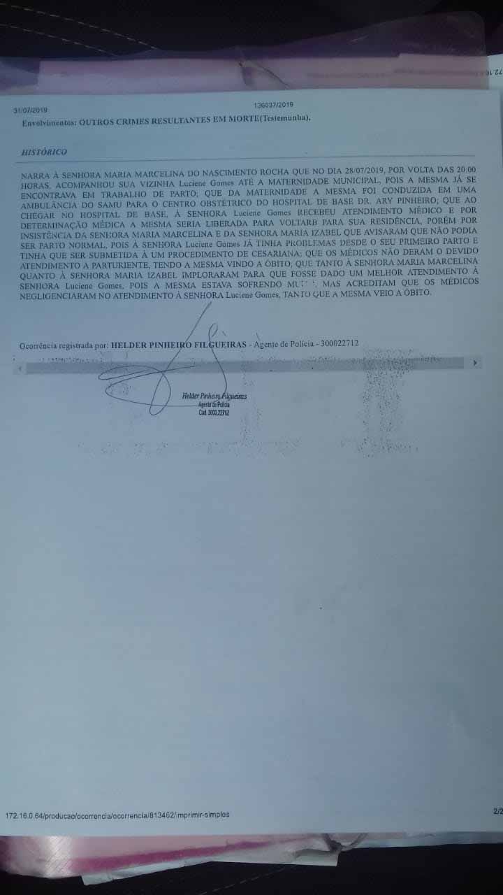 Após ocorrido, na tarde desta quinta-feira,31, duas vizinhas que acompanharam todo o drama de Luciene, e ainda tentaram intervir para salvar a parturiente, registraram uma ocorrência policial (nº 136037/2019) relatando: "outros crimes resultantes em morte (Consumado) relevância criminal. Data do fato 30/07/2019, como vítima Luciene Gomes, autor do fato Hospital de Base Ary Pinheiro".