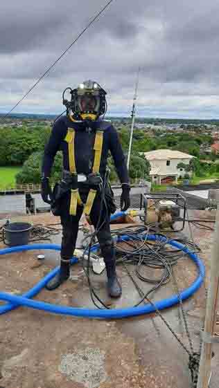 Evitando qualquer tipo de contaminação, o especialista usa uma vestimenta impermeável, hermeticamente fechada sobre um macacão térmico de neoprene. Na cabeça, uma máscara full face, espécie de capacete integralmente vedado, completa a proteção. Nele estão acopladas uma câmera de vídeo, lanterna e microfone. Essa estrutura se comunica com a superfície através de um duto que assegura a livre respiração e permite resistir à pressão da água. O trabalho é acompanhado por um mergulhador supervisor, que de fora do reservatório monitora o serviço e assiste em tempo real ao que está acontecendo embaixo d’água.