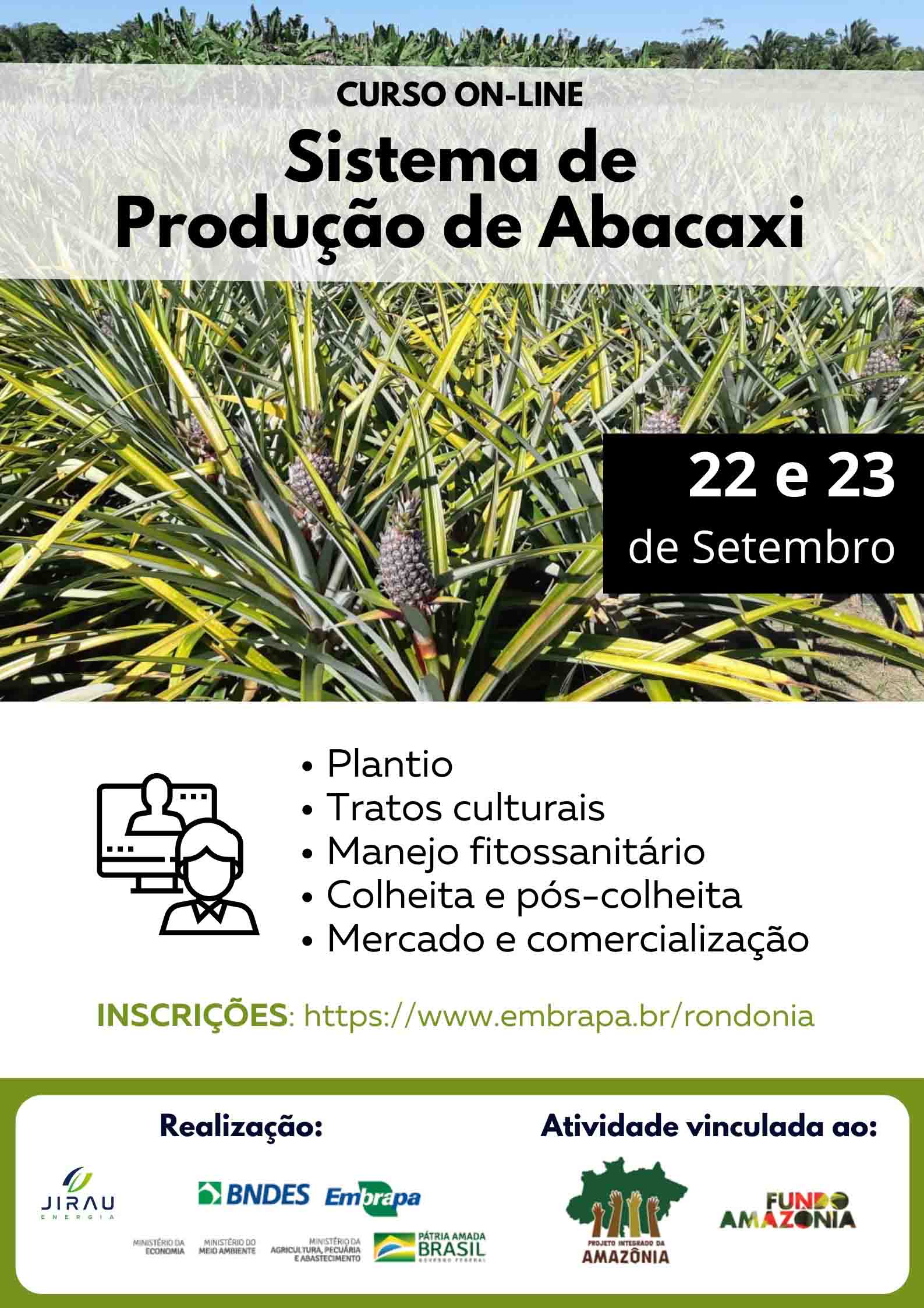 O curso abordará assuntos relacionados ao plantio, tratos culturais, manejo fitossanitário, colheita e pós-colheita, mercado e comercialização. Também serão apresentados o uso correto de indutor de florescimento, o controle de pragas e doenças e o uso de novas cultivares mais resistentes e adaptadas à região. O objetivo principal é capacitar técnicos para atuar em sistemas de produção de abacaxi em Rondônia. Assim como sensibilizar os produtores para aspectos importantes relacionados a este sistema, para que possam obter maior produtividade e, consequentemente, mais renda com esta atividade.
