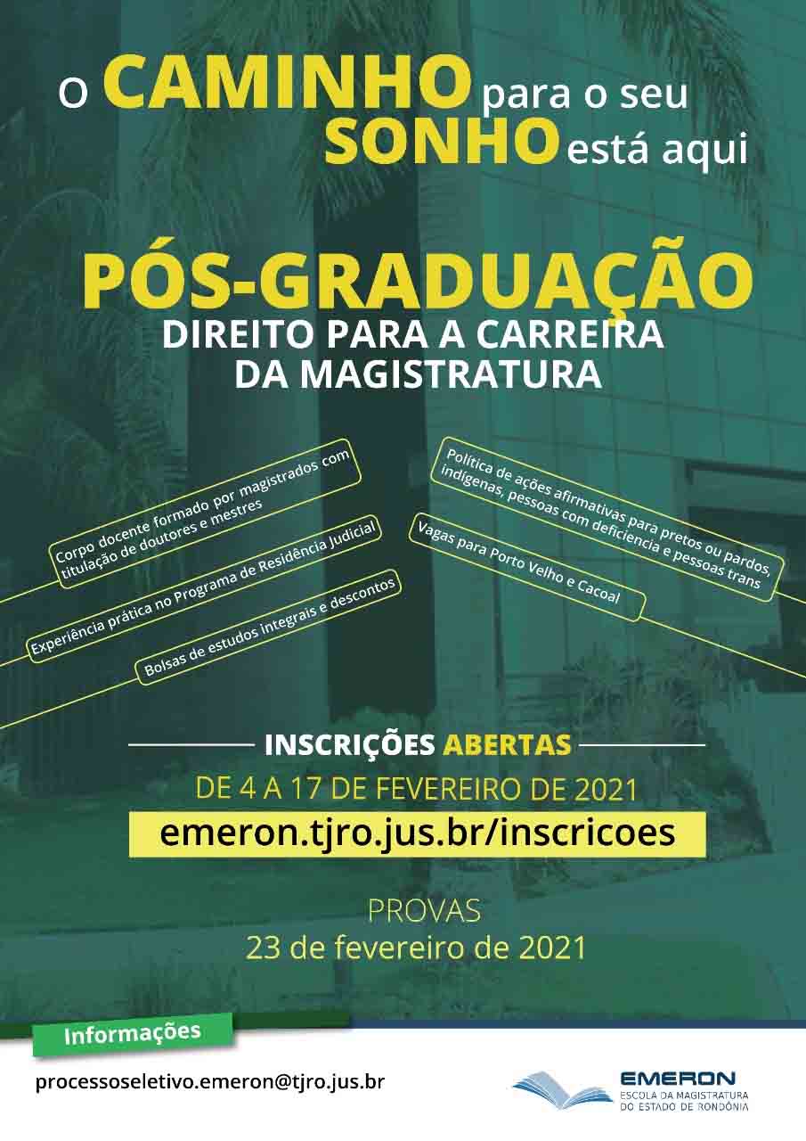 A Escola da Magistratura do Estado de Rondônia (Emeron) publicou hoje (3) o edital nº 1, que trata do processo seletivo para a turma 2021/2022 da Especialização em Direito para a Carreira da Magistratura (EDCM). A partir deste ano, a pós-graduação passará a contar com Política de Ações afirmativas, com reserva de vagas para grupos de minorias, concessão de bolsas de estudo e descontos nas mensalidades.