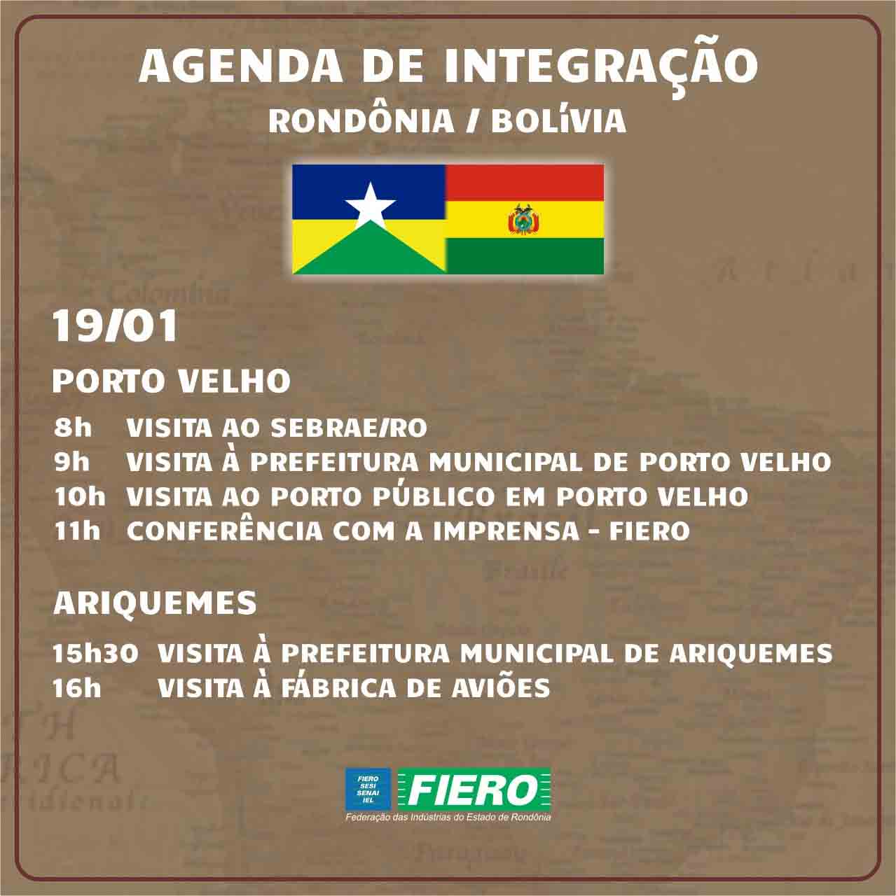O evento terá início ás 8h com uma visita ao Sebrae em Rondônia, depois a programação segue com visita a Prefeitura de Porto Velho e visita ao Porto Público em Porto Velho. Às s 11h haverá uma coletiva com imprensa na Federação das Indústrias de Rondônia (Fiero) e, pela parte da tarde, a comitiva irá ao município de Ariquemes para uma visita à Prefeitura e um fábrica de aviões. Nesta sexta (15), às 19h, nos canais do Sebrae e da Fiero, haverá uma transmissão ao vivo, já antecipando as discussões da visita da próxima terça. Para acompanhar, basta acessa www.sebrae.ro/brasil-bolivia .